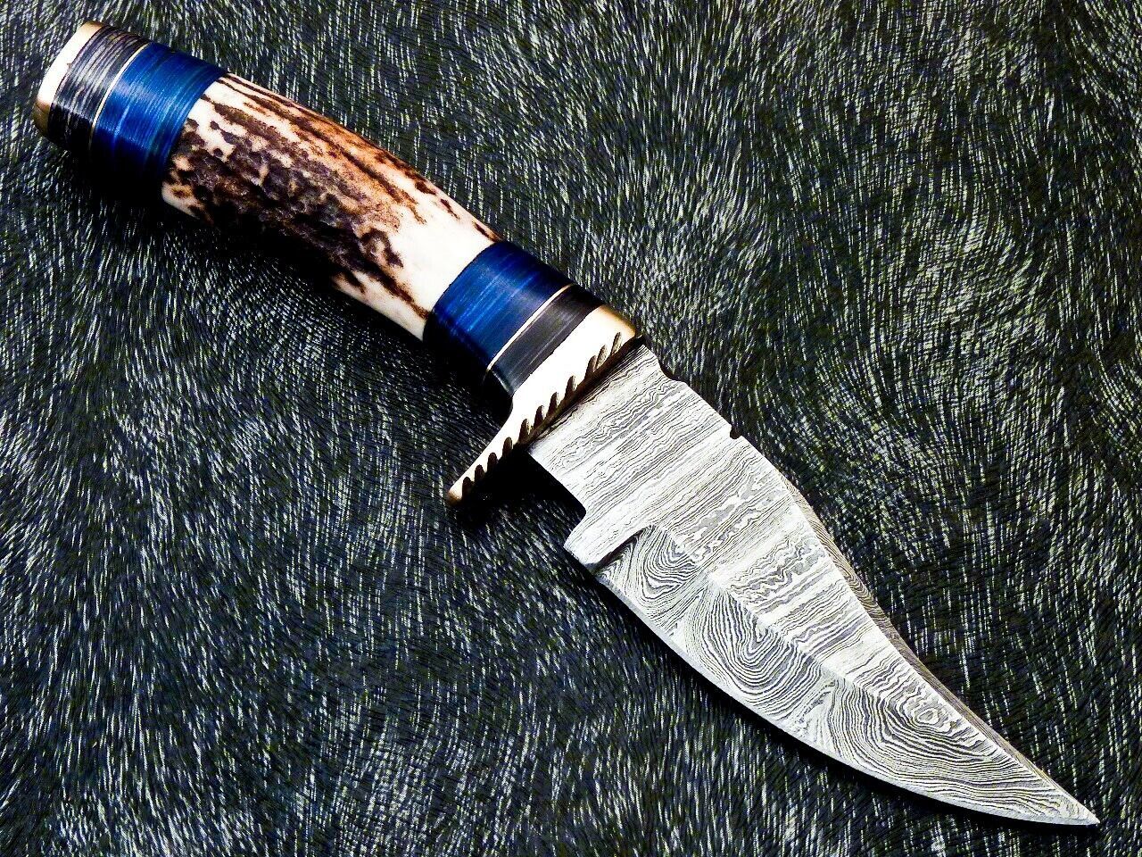 8" Damascus Steel Bowie Knife – Stag Antler & Hardwood Handle with Leather Sheath