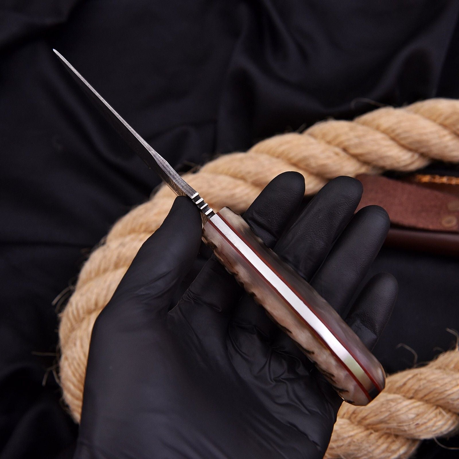Experience the perfect blend of tradition and utility with this 8-inch Custom Hand Forged Damascus Steel Small Tracker Knife. Expertly crafted for hunters, campers, survivalists, and collectors, this knife combines the rugged strength of Damascus steel with the natural beauty of a ram horn handle.The 4.3-inch blade is forged from multiple layers of high carbon steel and nickel alloy steel through a meticulous process of hammering, folding, and stretching. This gives the blade its signature Damascus pattern, excellent toughness, edge retention, and cutting performance.Paired with a 3.7-inch genuine ram horn handle, the knife offers a secure grip with a touch of natural elegance. Every handle is unique, showcasing natural variations in color and texture. A genuine leather sheath is included, providing both protection and easy belt carry.Each knife is 100% handmade, ensuring individuality in both blade pattern and handle design—making it a functional tool as well as a collectible work of art.
