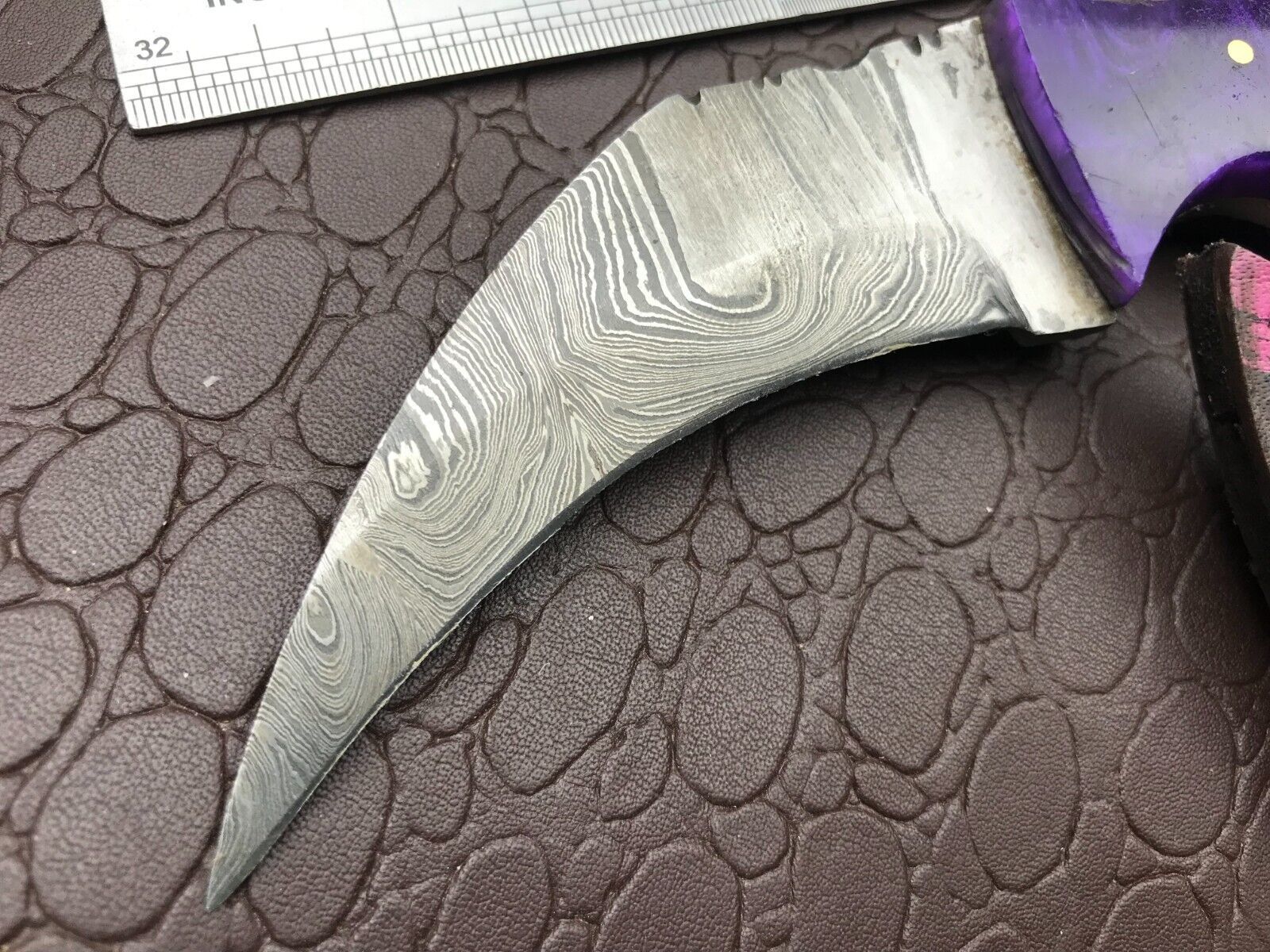 - Curved damascus steel karambit blade for improved slicing precision