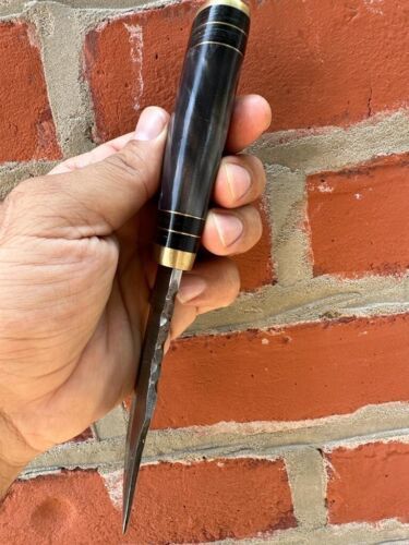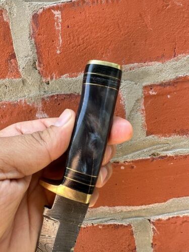 Experience the perfect balance of craftsmanship and performance with this Handmade Damascus Steel EDC Hunting Knife. Expertly forged from over 352 layers of 15N20 and 1095 high carbon steel, this fixed blade knife is oil tempered to a hardness of 58–60 HRC, ensuring outstanding edge retention and long-lasting durability. The blade’s hand-forged Damascus pattern makes each knife a unique piece of functional art.Measuring 8 inches overall, this knife features a 4-inch razor-sharp blade and a 4-inch resin handle with a brass guard for enhanced grip, control, and comfort. The forward section of the blade is uniquely designed and weighted for chopping, allowing it to perform multiple functions—working effectively as both a knife and a small hand axe. Whether for skinning, chopping, or general survival tasks, this versatile tracker-style hunting knife is built to handle it all.Each knife comes with a premium handmade leather sheath, providing safe storage and easy portability for outdoor adventures. Perfect for hunting, survival, camping, bushcraft, and everyday carry, this Damascus steel knife is a must-have for outdoor enthusiasts and collectors alike.