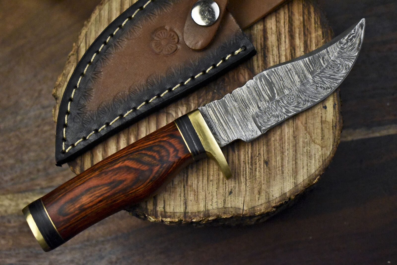8" Handmade Twist Damascus Skinner Knife with Hardwood Handle and Brass Guard – Unique Hunting Blade