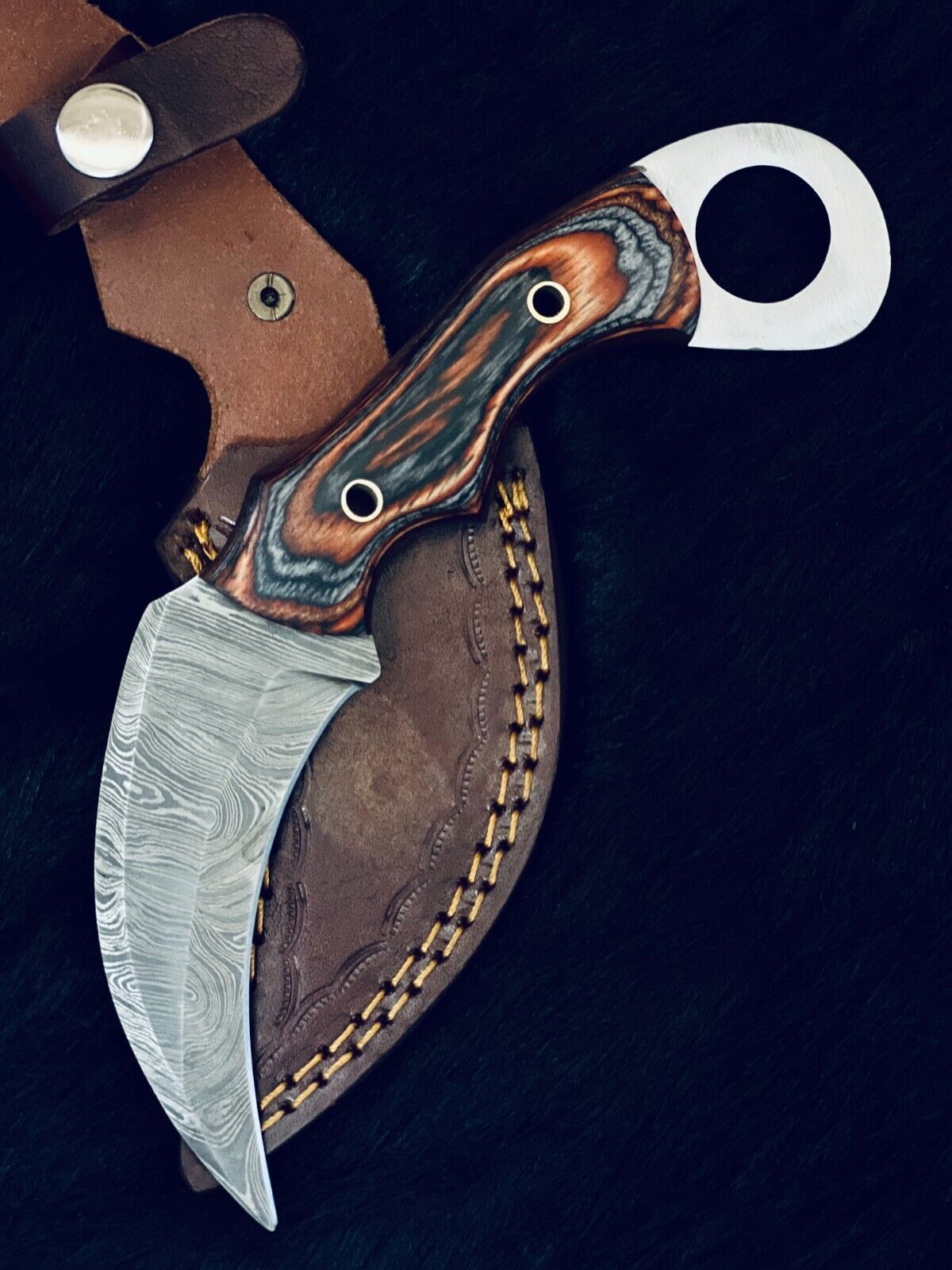 Ideal for hunters, tactical users, and collectors alike, this handmade karambit is engineered for precision and durability. A handcrafted leather sheath is included for secure carry and protection. Whether you’re out in the wild or building a collection, this knife reflects true Damascus artistry.