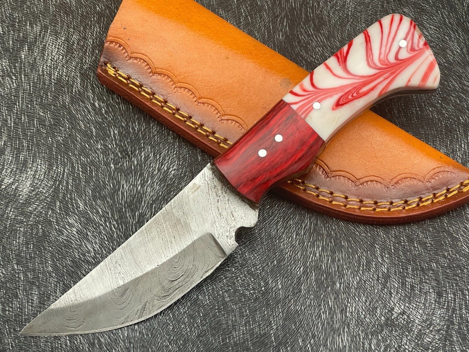 This knife comes with a hand-stitched genuine leather sheath, custom fitted to protect the blade and provide easy carry on outdoor adventures. Whether you're an avid outdoorsman or a collector, this custom Damascus skinning knife is a valuable addition to your gear.