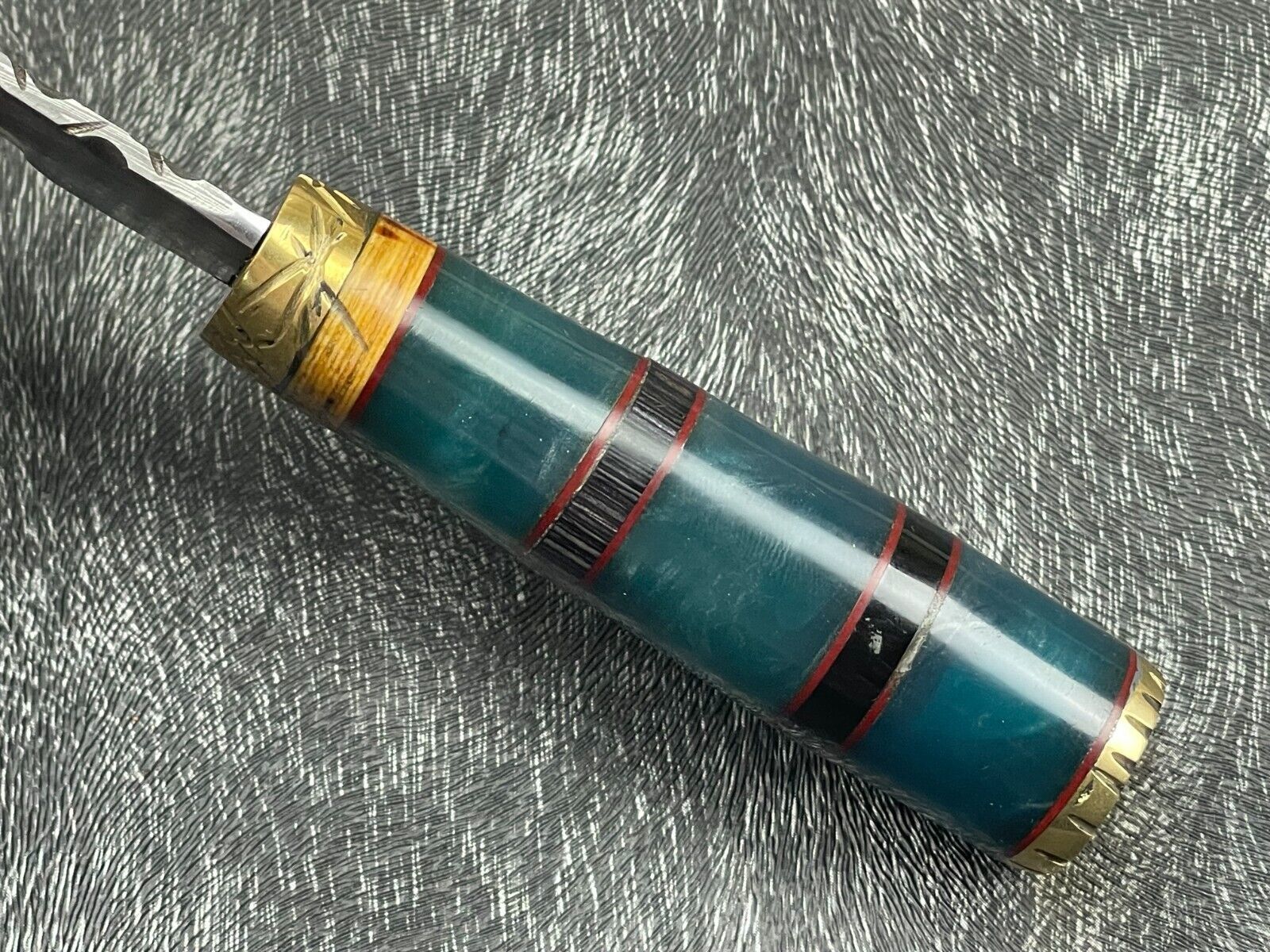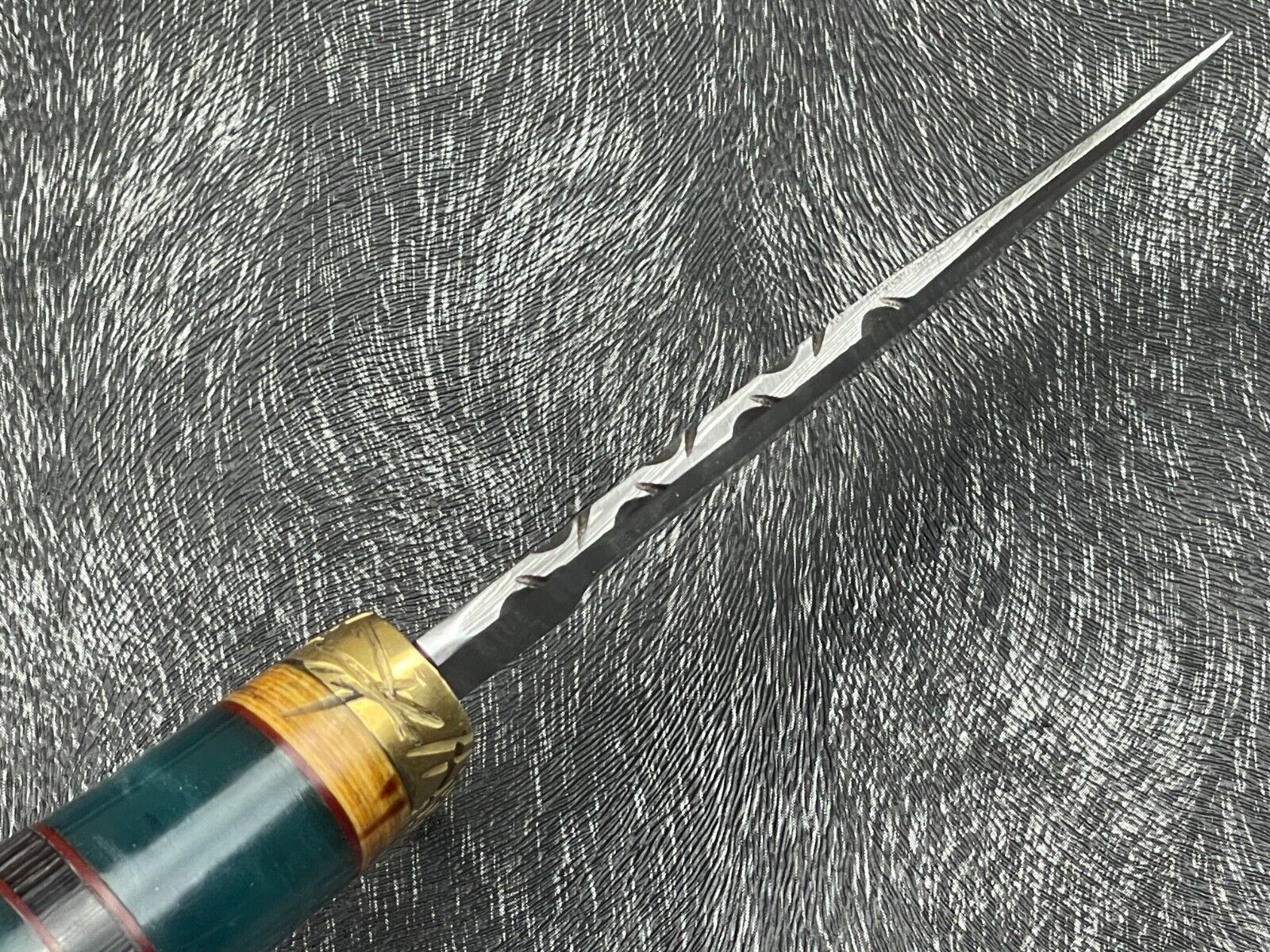 The handle is crafted from a combination of beautiful resin and hardwood scales, securely fastened with brass pins and paired with a hand-casted brass bolster for added balance. Detailed file work along the spine adds artistic elegance while enhancing grip. With an overall length of 8 inches, this compact yet powerful Bowie knife ensures precise control and versatility.