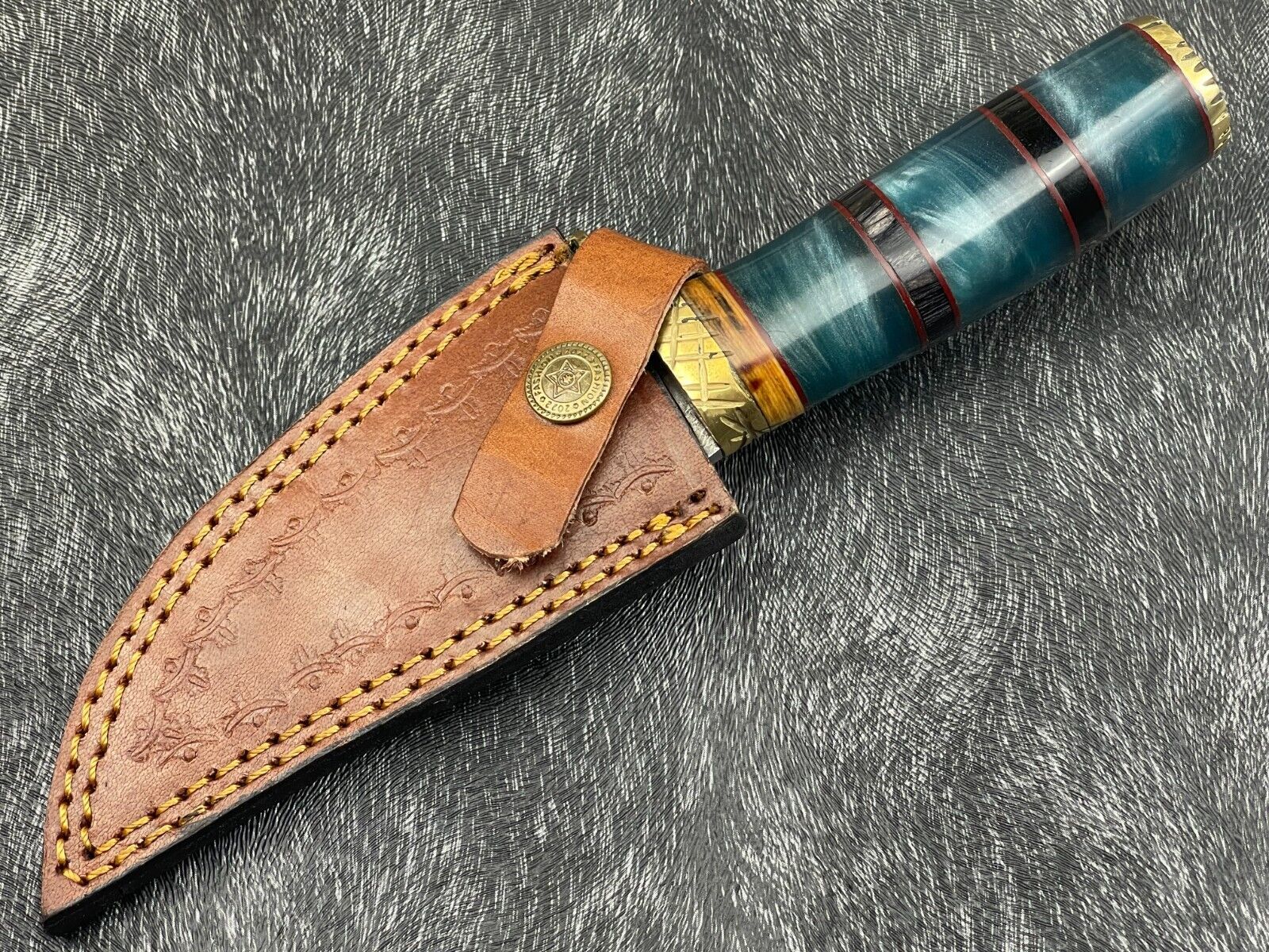 Each knife is unique due to the natural materials used, making every piece a functional work of art. The knife comes with a premium leather sheath for safe storage and easy carry.