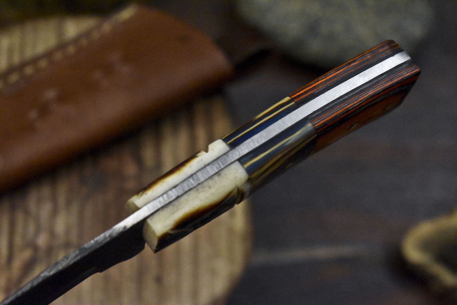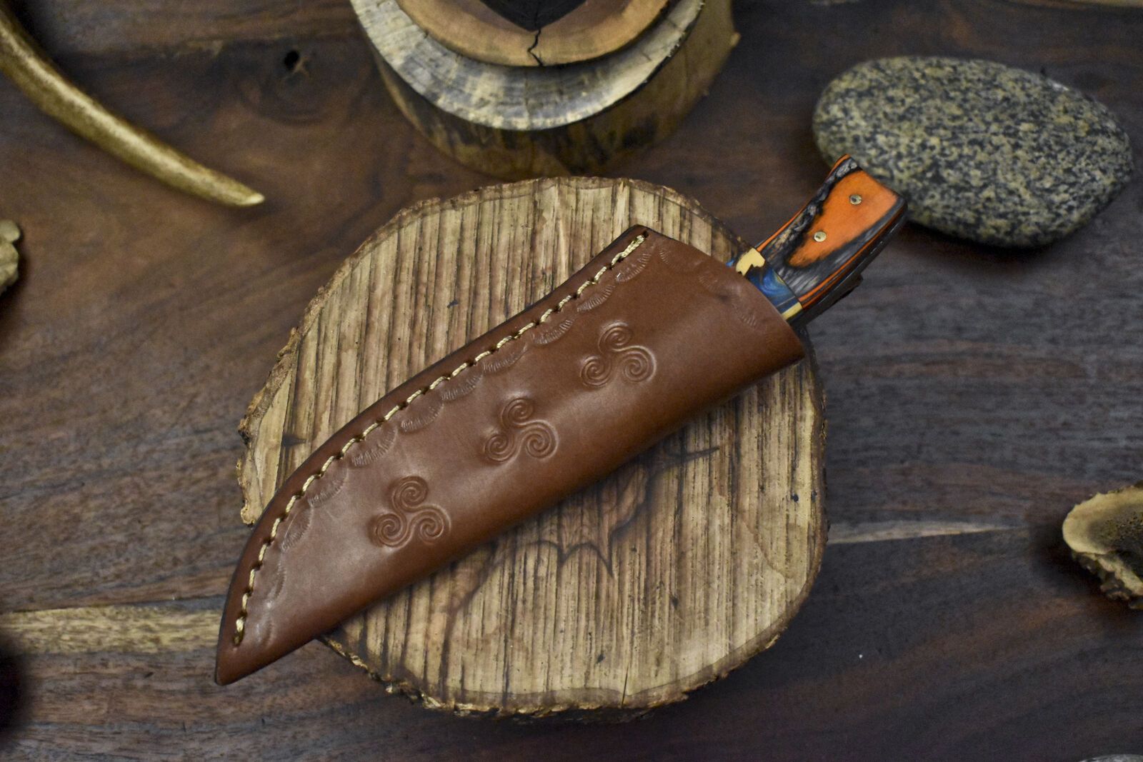 The knife includes a hand-sewn leather sheath with reinforced stitching for safe storage and rugged wear. Whether you're a seasoned outdoorsman or a collector of handmade blades, this full-tang knife is engineered to deliver reliability, edge retention, and eye-catching design.