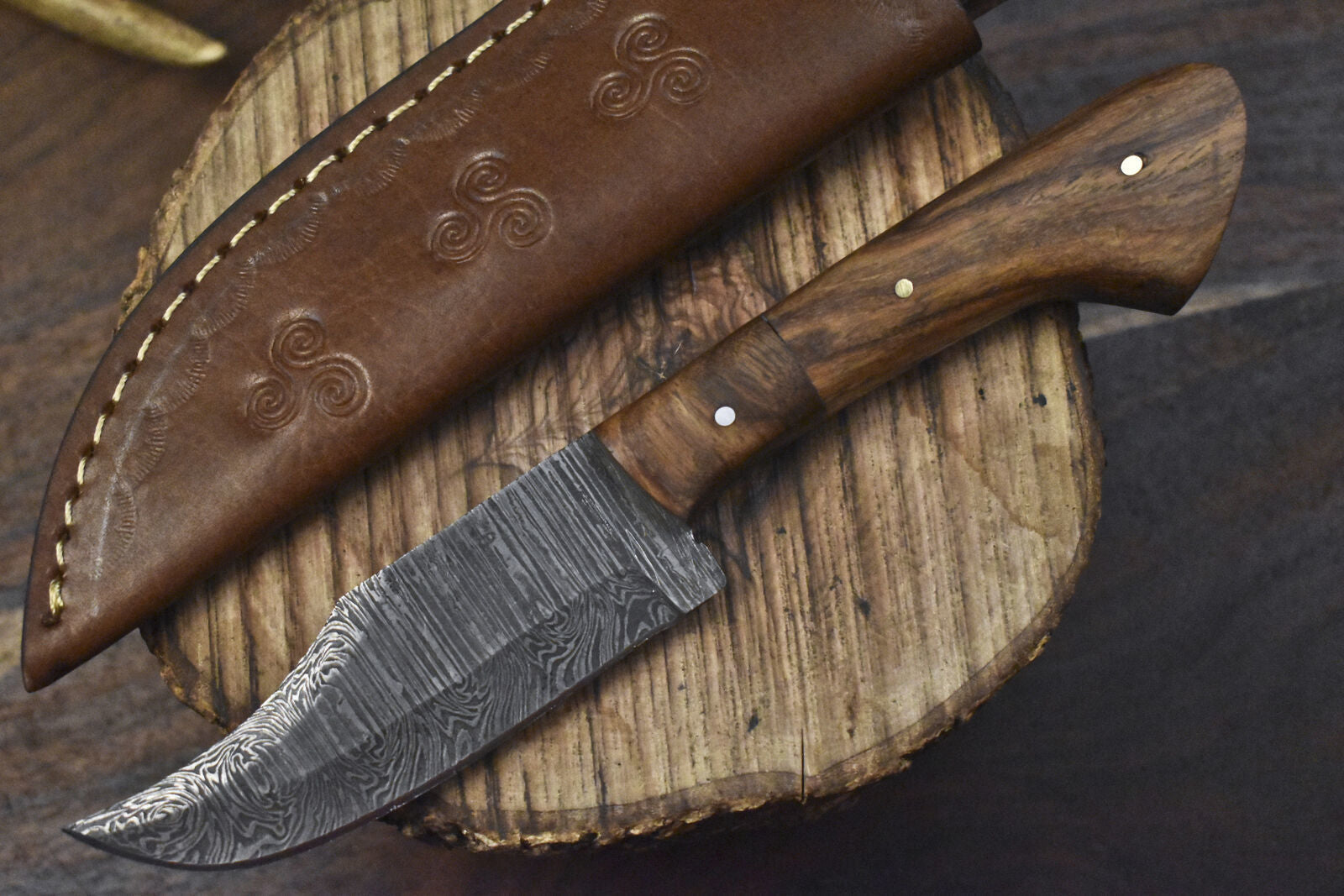 This custom handmade Damascus skinner knife is a rare find for collectors and outdoor enthusiasts. Featuring a stunning twist Damascus steel blade, a premium walnut wood handle, and a sturdy wooden bolster, this knife is crafted for both performance and aesthetics. With an overall length of 8 inches, a 4-inch blade, and a 4-inch handle, it offers excellent control for hunting, skinning, or everyday carry. The blade is oil-tempered to 58–60 HRC, ensuring lasting sharpness and edge retention.
