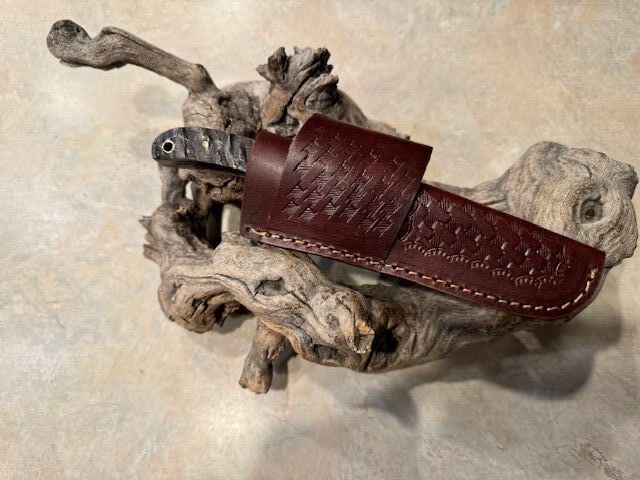 This custom bull cutter knife is fitted with a 4 inch genuine rams horn handle, offering a natural and secure grip.The full tang construction adds stability, making it a dependable cowboy bull cutter knife. The handle complements the blade’s durability, placing it among premium calf cutter knives and traditional ranch style knives.