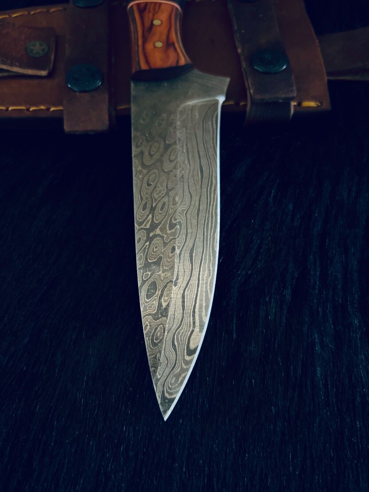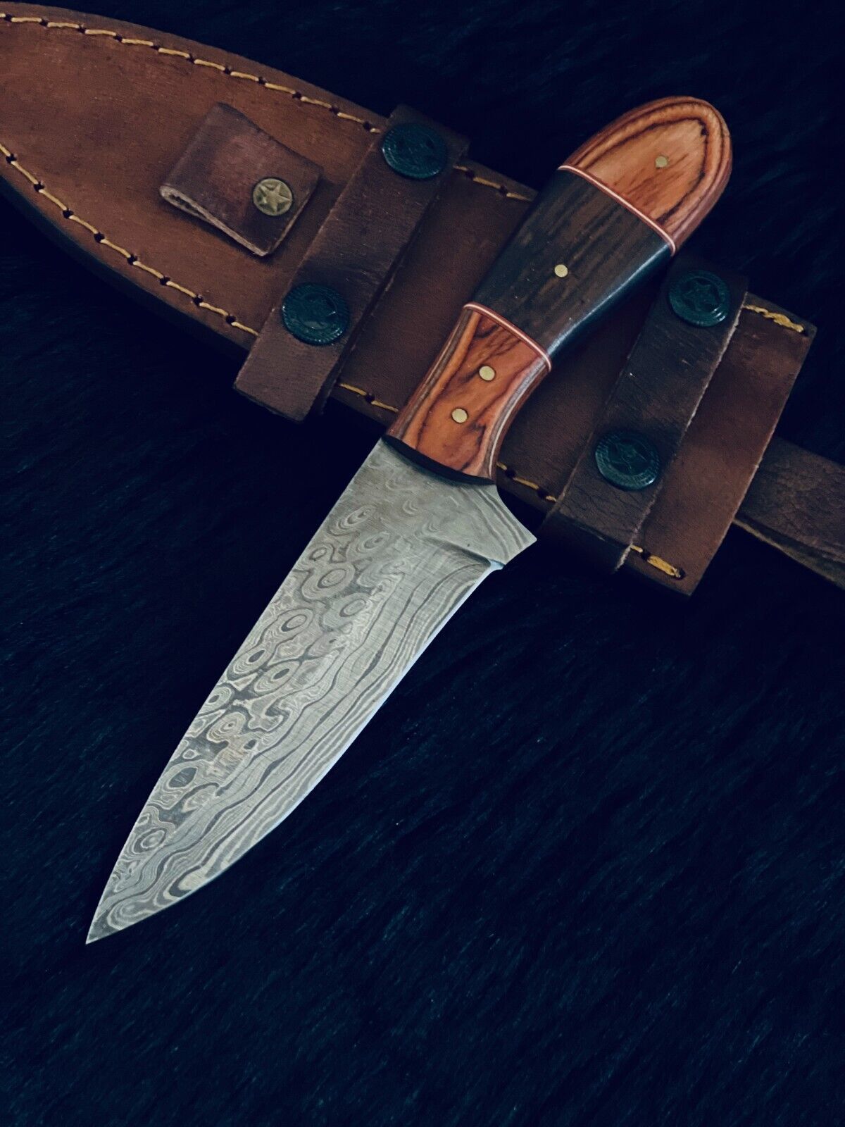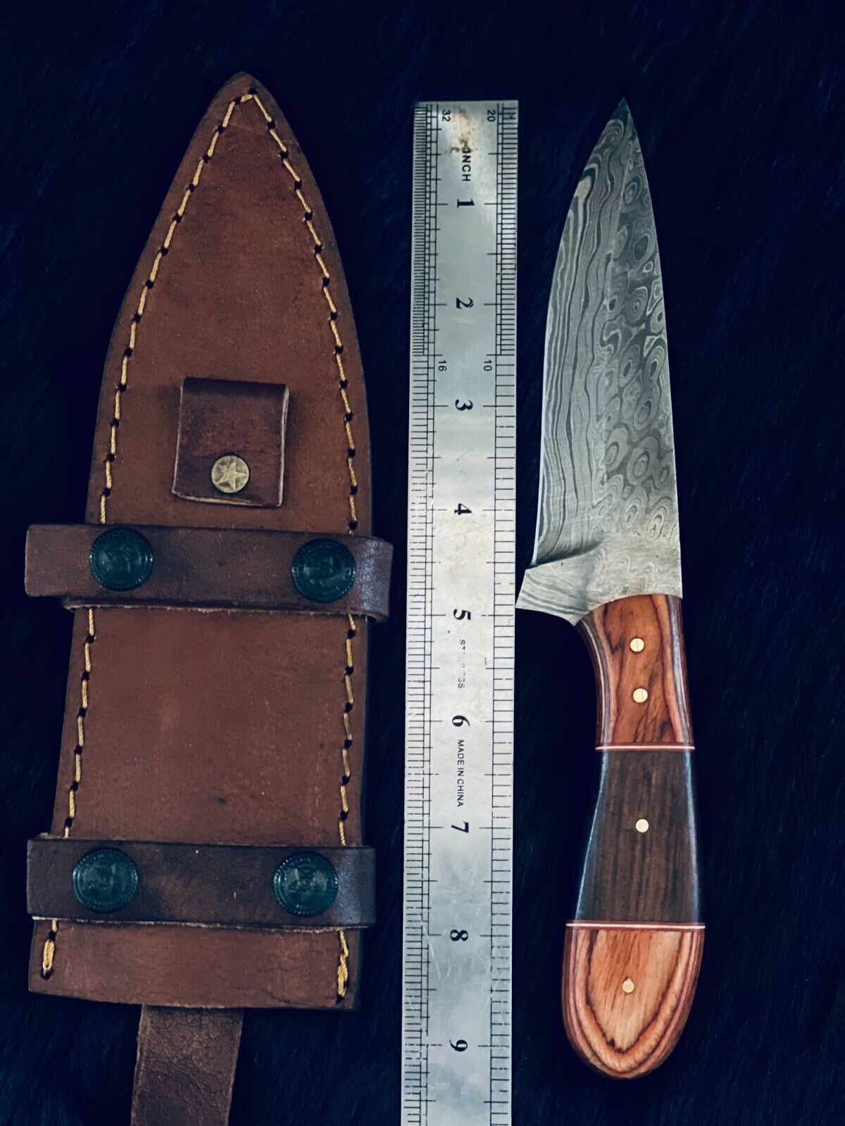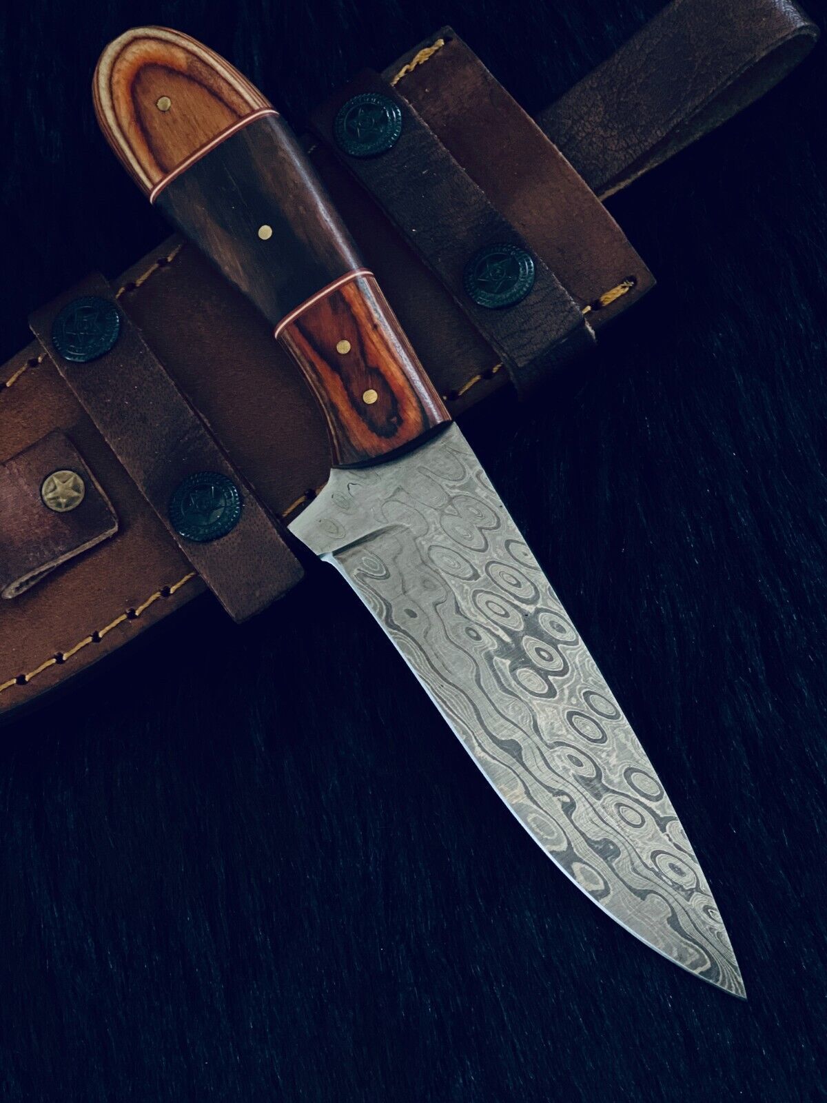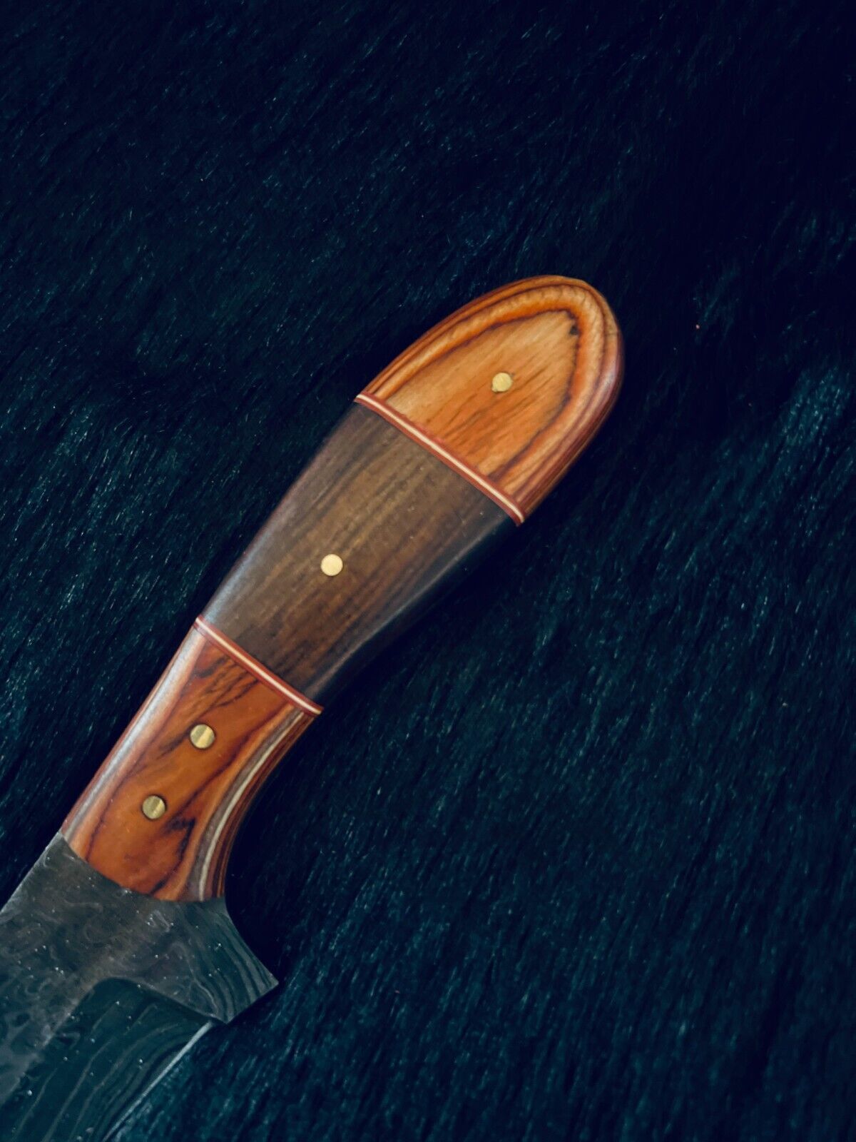 The ergonomic handle is crafted from stained camel bone and natural wood, accented with brass spacers and finished with a handmade Damascus steel bolster. This combination not only enhances grip comfort but also gives the knife an elegant, one-of-a-kind look.