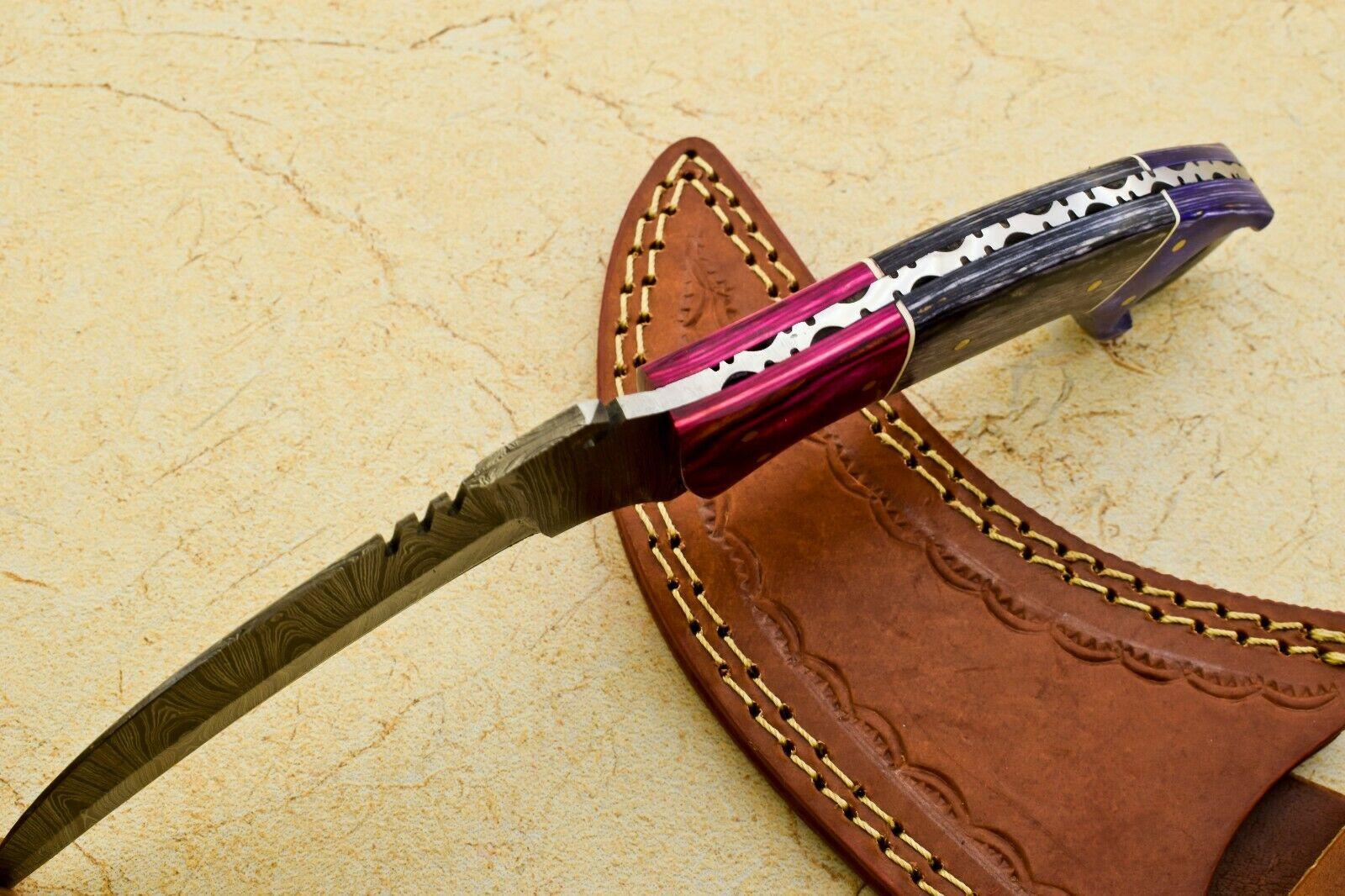 This full tang damascus karambit features a durable wood handle designed for comfort and secure grip. Its solid build ensures stability for extended outdoor tasks. Paired with a leather karambit with sheath, it allows safe storage and convenient carry.