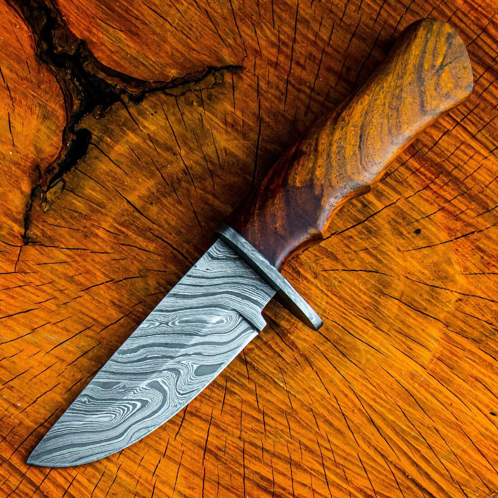 9" Custom Damascus Steel Bowie Knife – Wooden Handle & Leather Sheath