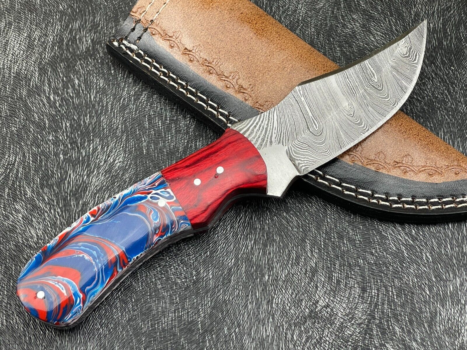 9" Damascus Steel Bowie Knife – Resin & Hardwood Handle with Leather Sheath