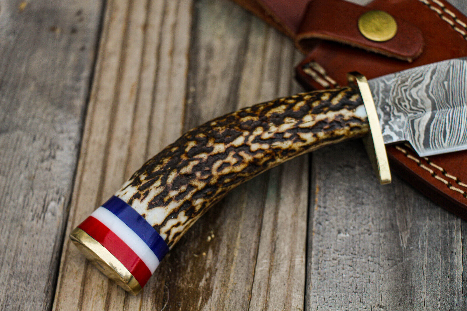 With a Rockwell hardness of 60 HRC, this knife is built to perform — sharpened at a 20° angle using a 1500-grit wheel for a razor-edge finish. The stag antler handle offers a unique grip, enhanced with a brass guard and an eye-catching Red, White & Blue resin base, sealed with clear polyurethane for durability and resistance to cracking.