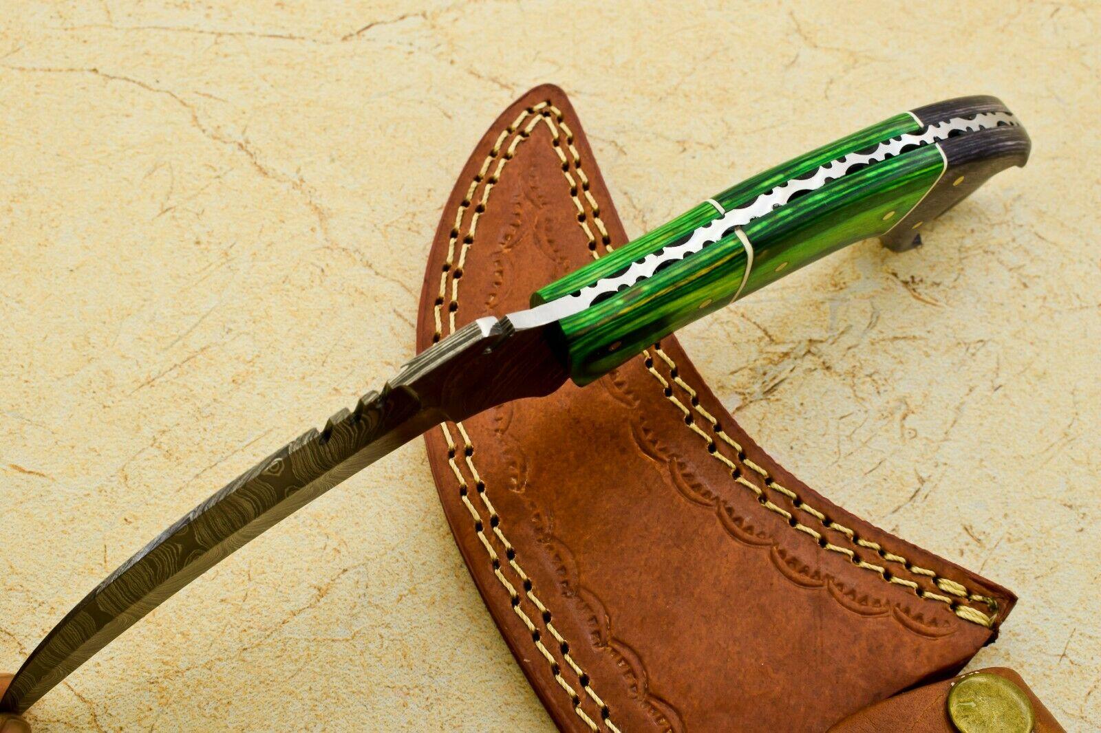 This full tang damascus karambit features durable hardwood handle scales for stability. The extended tang construction enhances balance and structural integrity during demanding tasks.Paired with the included sheath, this karambit with sheath is ready for safe storage and carry.