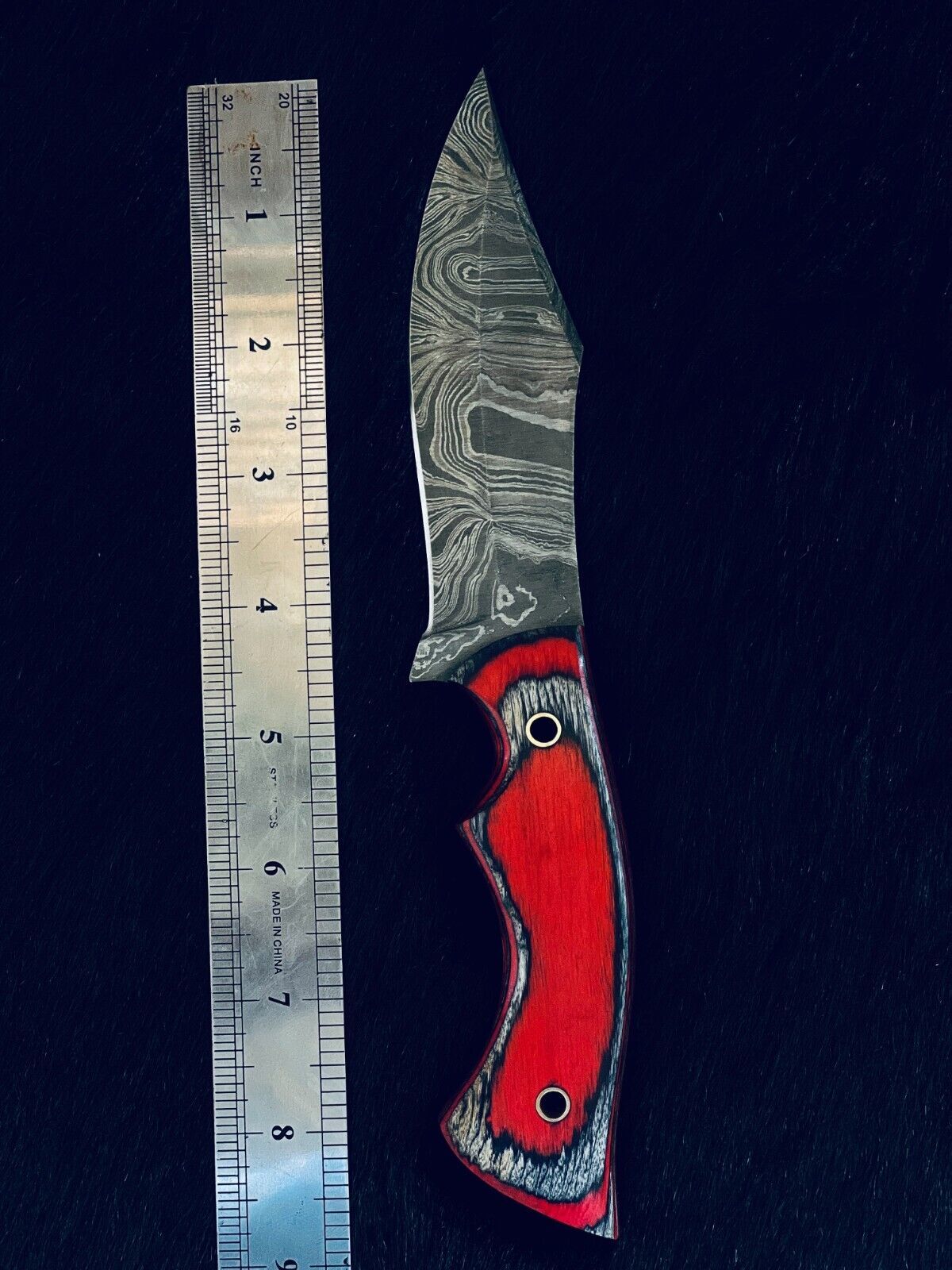 Built with a full tang structure and a 4.05" handle made from stained camel bone and natural wood, the knife also features elegant brass spacers and a handmade Damascus bolster. The 4mm thick blade ensures dependable strength, while the intricate forging process enhances both functionality and aesthetics.