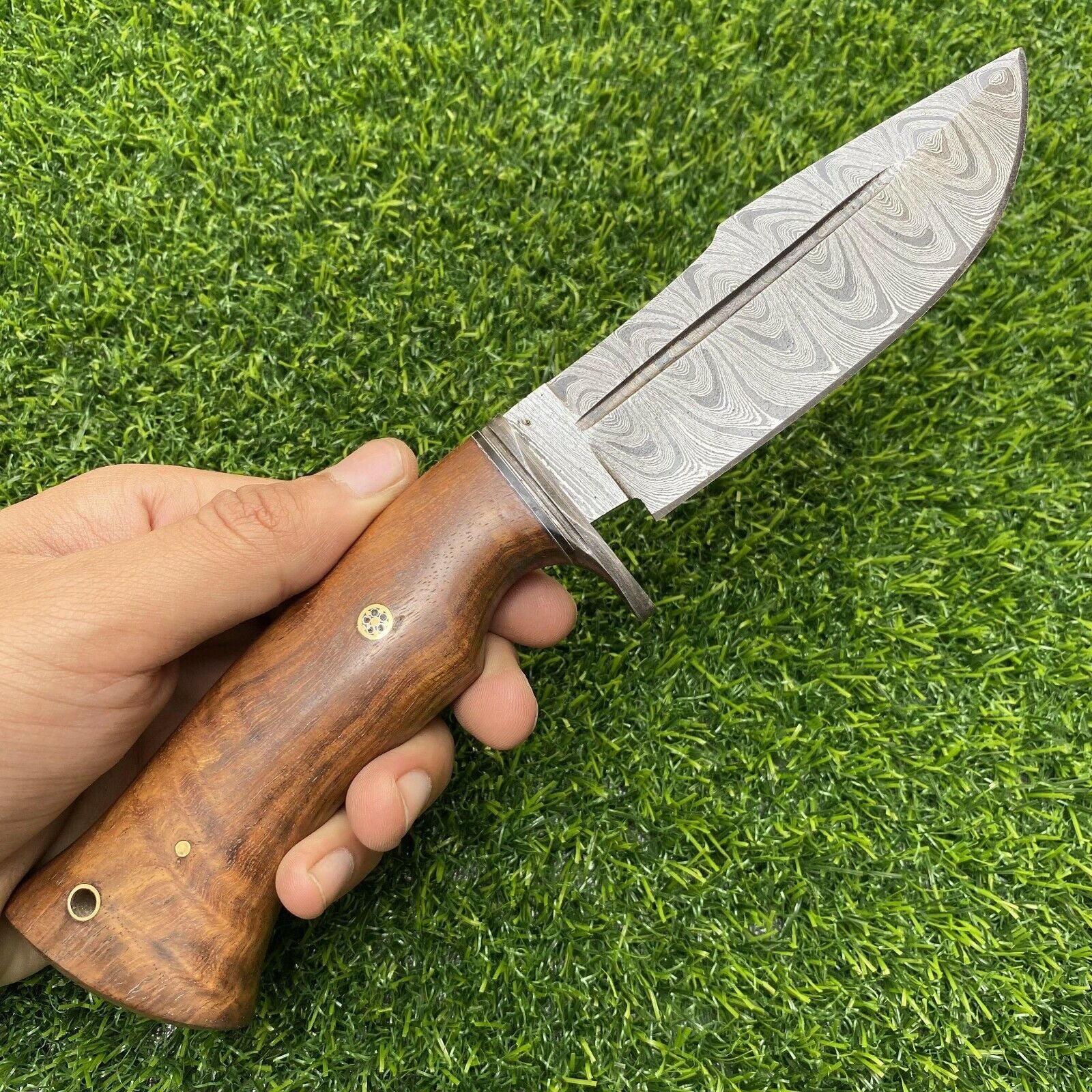 This 9 inch Damascus hunting Bowie knife is a custom handmade tool crafted for hunters, collectors, and outdoor enthusiasts who value performance and elegance. The 5-inch blade is forged from premium Damascus steel, made using the traditional layering technique that fuses high carbon steels to create a striking wave pattern. It offers excellent edge retention, durability, and a Rockwell hardness of 55–60 HRC.