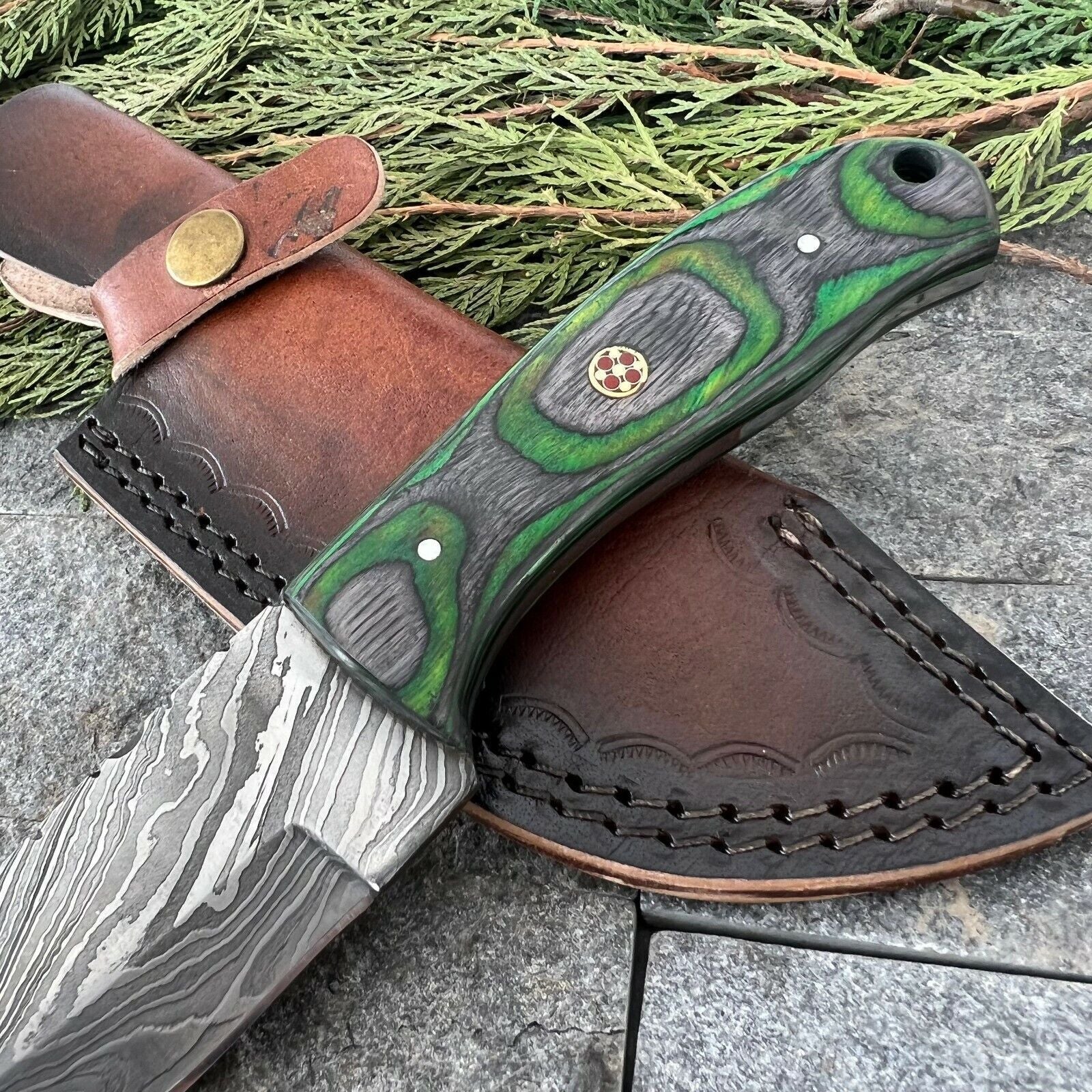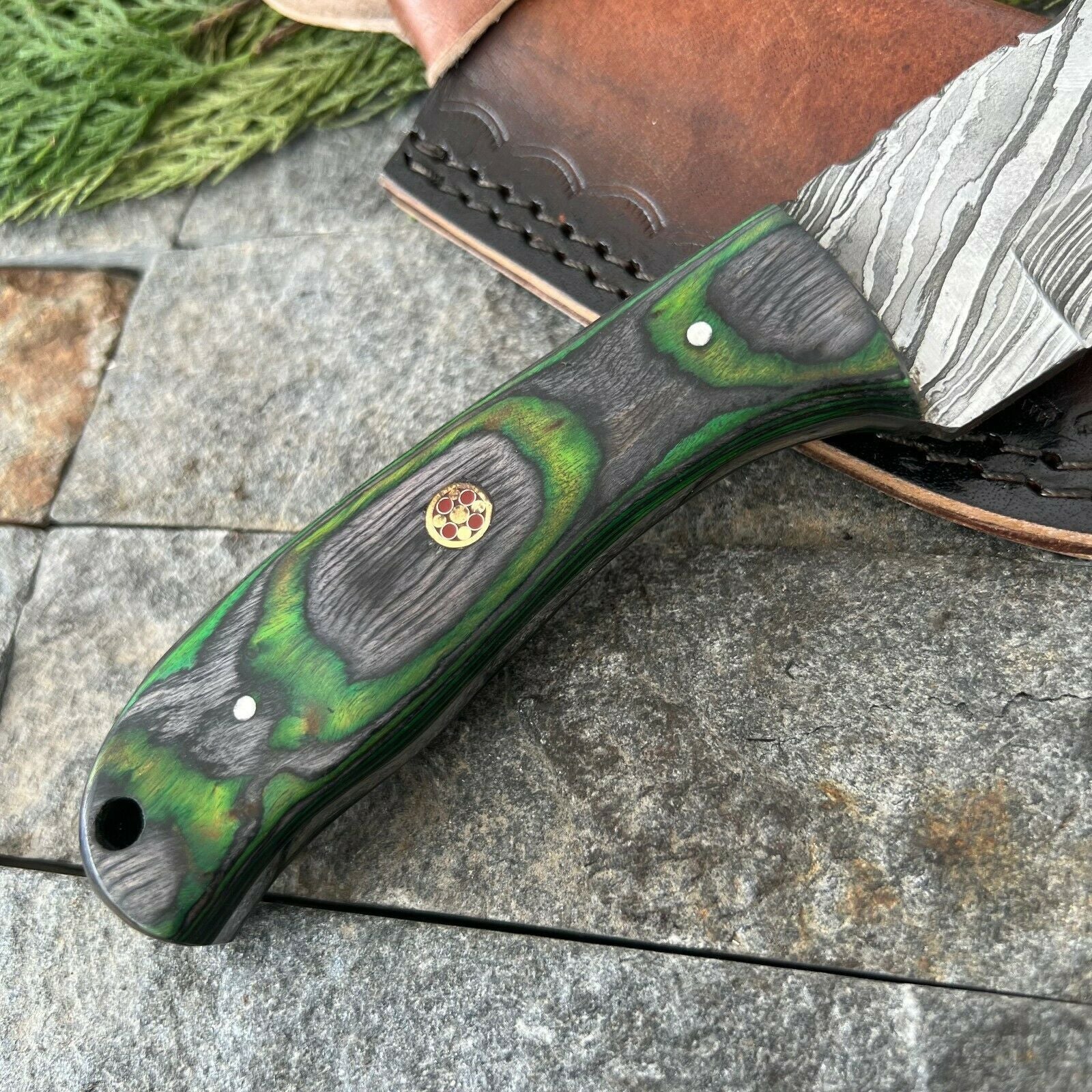 Its ergonomic 4-inch wooden handle provides a firm, ambidextrous grip, making it ideal for hunting, skinning, camping, and everyday carry (EDC). Whether you're processing game in the wild or tackling routine outdoor tasks, this knife delivers unmatched control and cutting power. Each blade is etched and polished to reveal the striking Damascus layers, ensuring every piece is a unique, hand-forged work of art.