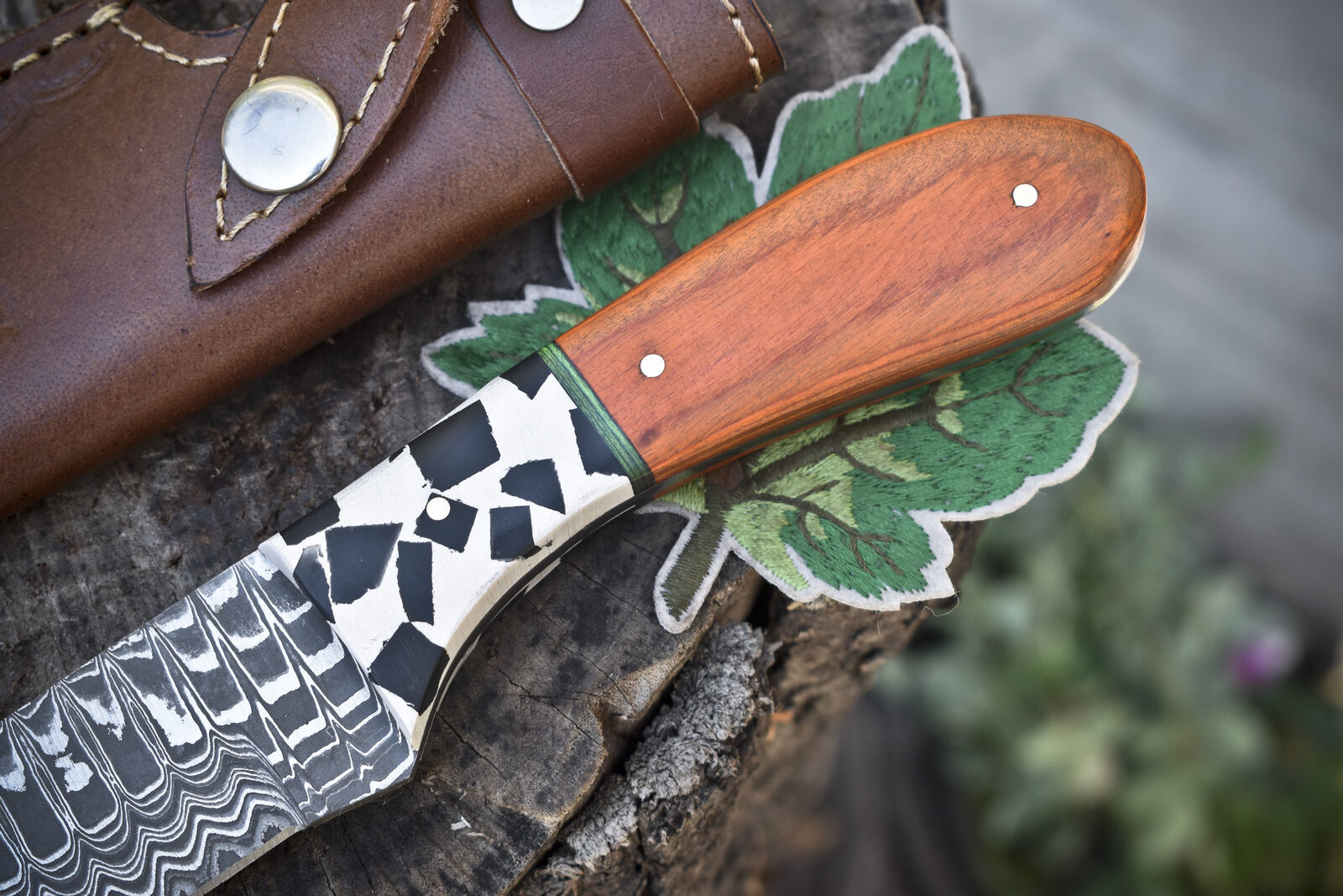 This 9-inch custom handmade skinner knife is a functional and elegant tool crafted for hunting, outdoor survival, and everyday field use. The 4.5-inch ladder-pattern Damascus blade is meticulously hand-forged from 1095 and 15N20 high-carbon steel, layered and acid-etched to create a striking ladder design. This forging process produces a blade that is not only visually stunning but also exceptionally tough and razor-sharp.