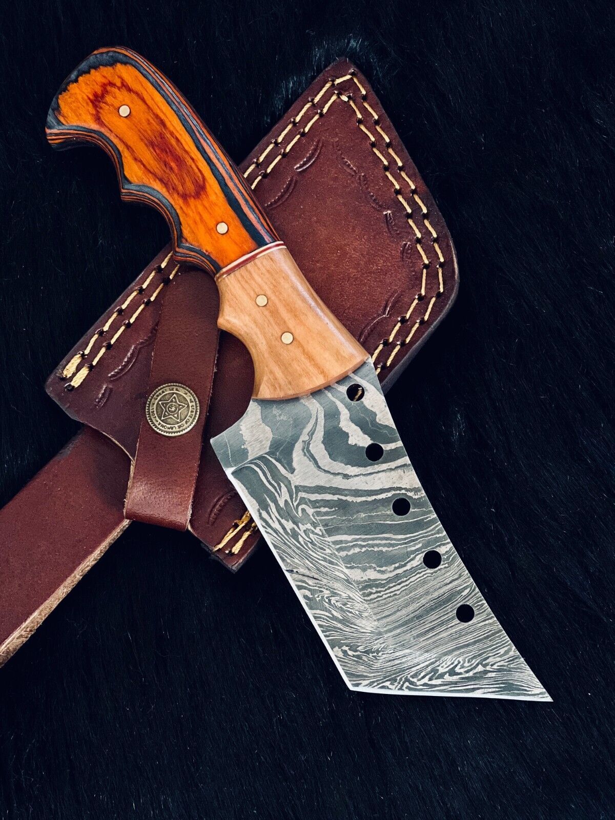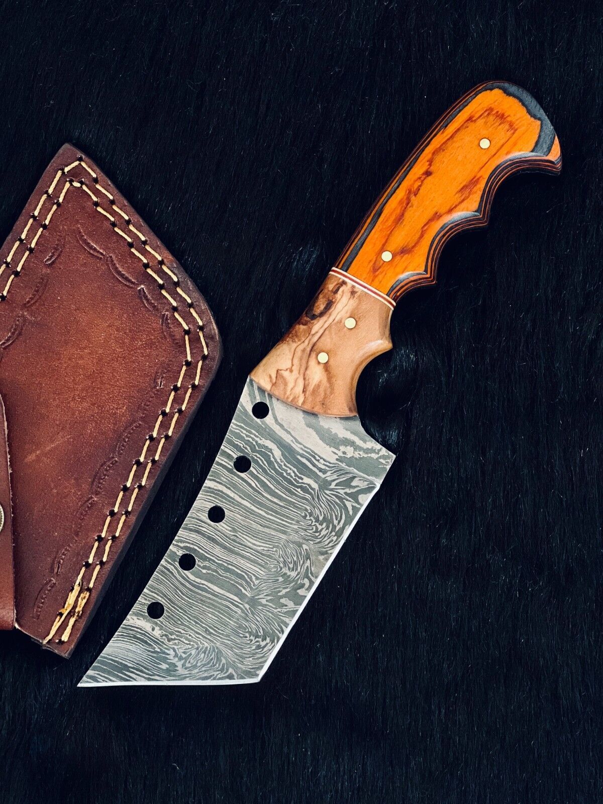 The blade features a classic Tanto tip, known for its superior piercing capability, making it an excellent choice for survival, tactical, and bushcraft tasks. The handle is crafted from stained camel bone and natural wood, elegantly accented with brass spacers and a Damascus bolster to provide both grip and balance.