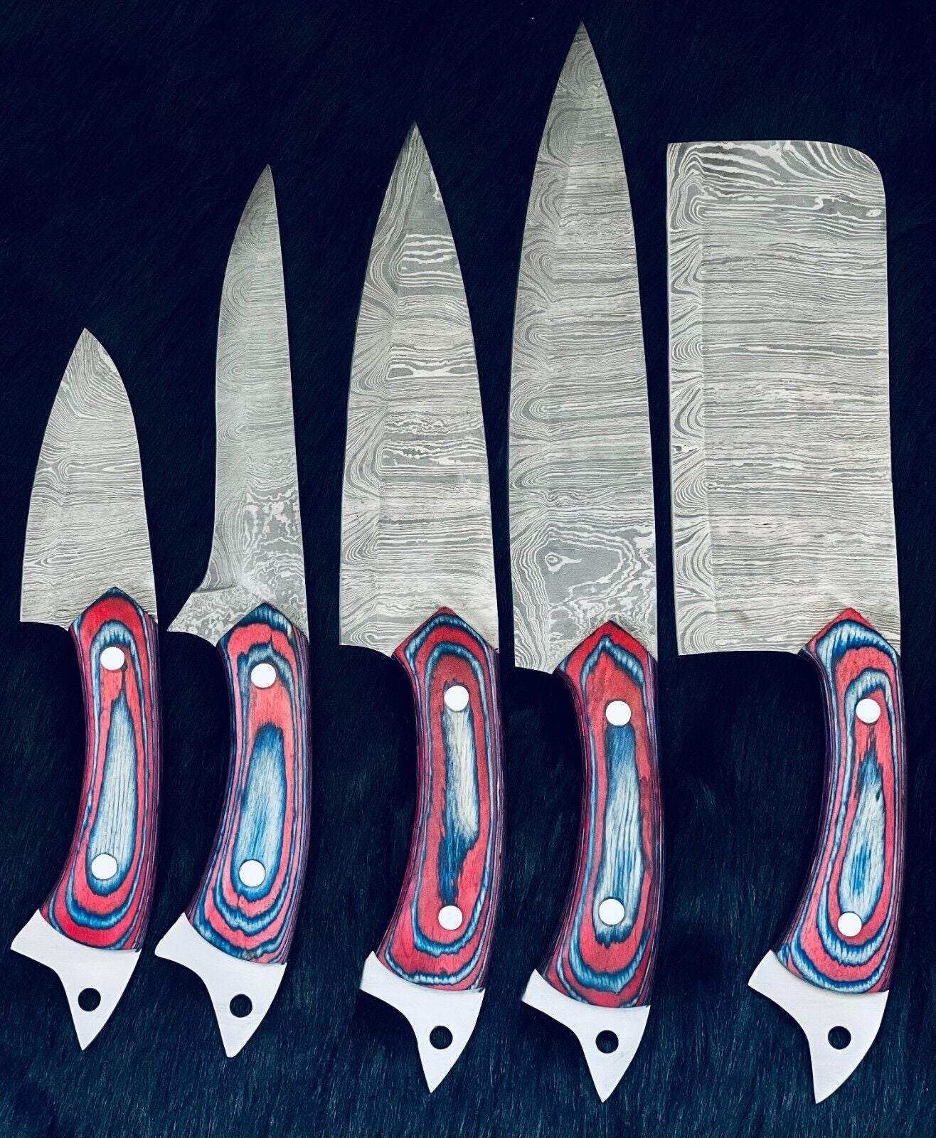 This 9" to 13" custom handmade Damascus steel chef knife set is crafted with precision and durability in mind. Each blade is forged from genuine Damascus steel, offering strength, sharpness, and a striking pattern that makes every piece unique. The handles are skillfully designed with stained camel bone and natural wood, accented with brass spacers and a handmade Damascus bolster for both beauty and comfort. These knives are not only visually stunning but also fully functional, making them perfect for professional chefs, home kitchens, hunting, camping, or gifting. Every knife is 100% handmade, ensuring quality craftsmanship and long-lasting performance.