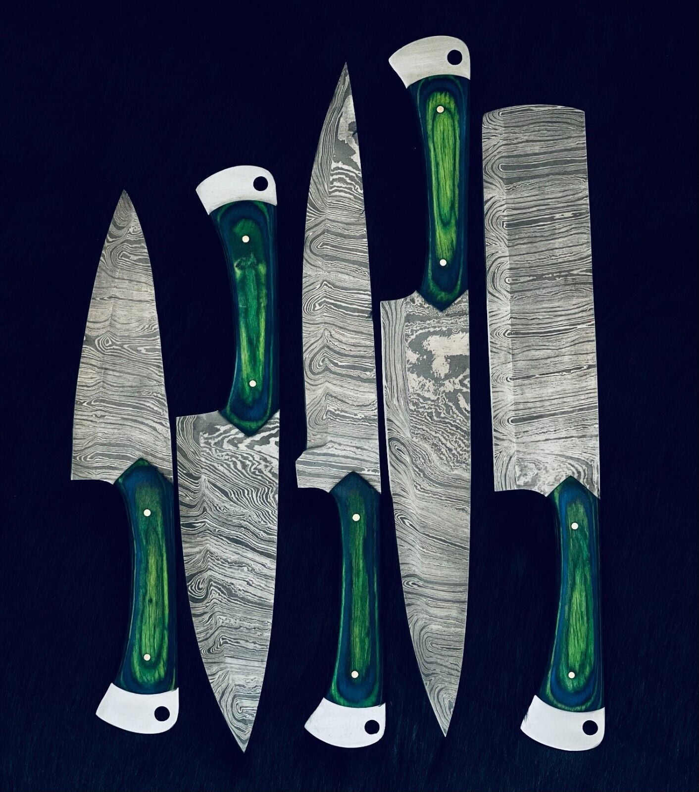 9" to 13" Custom Handmade Damascus Steel Chef Set | Kitchen Knives with Camel Bone & Wood Handle