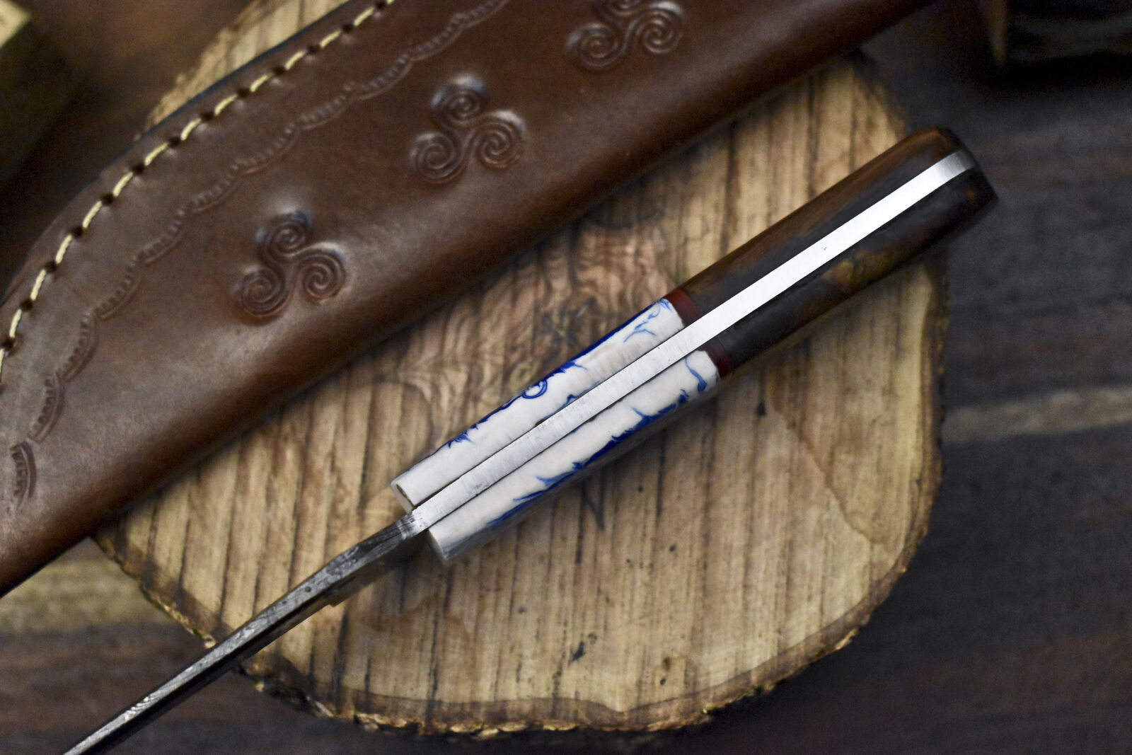 Every piece is hand-forged and comes with a custom leather sheath for safe carry and storage. Whether you're in the field or adding to your collection, this damascus skinner hunting knife combines beauty and functionality. It also makes a thoughtful gift for hunters and outdoorsmen.