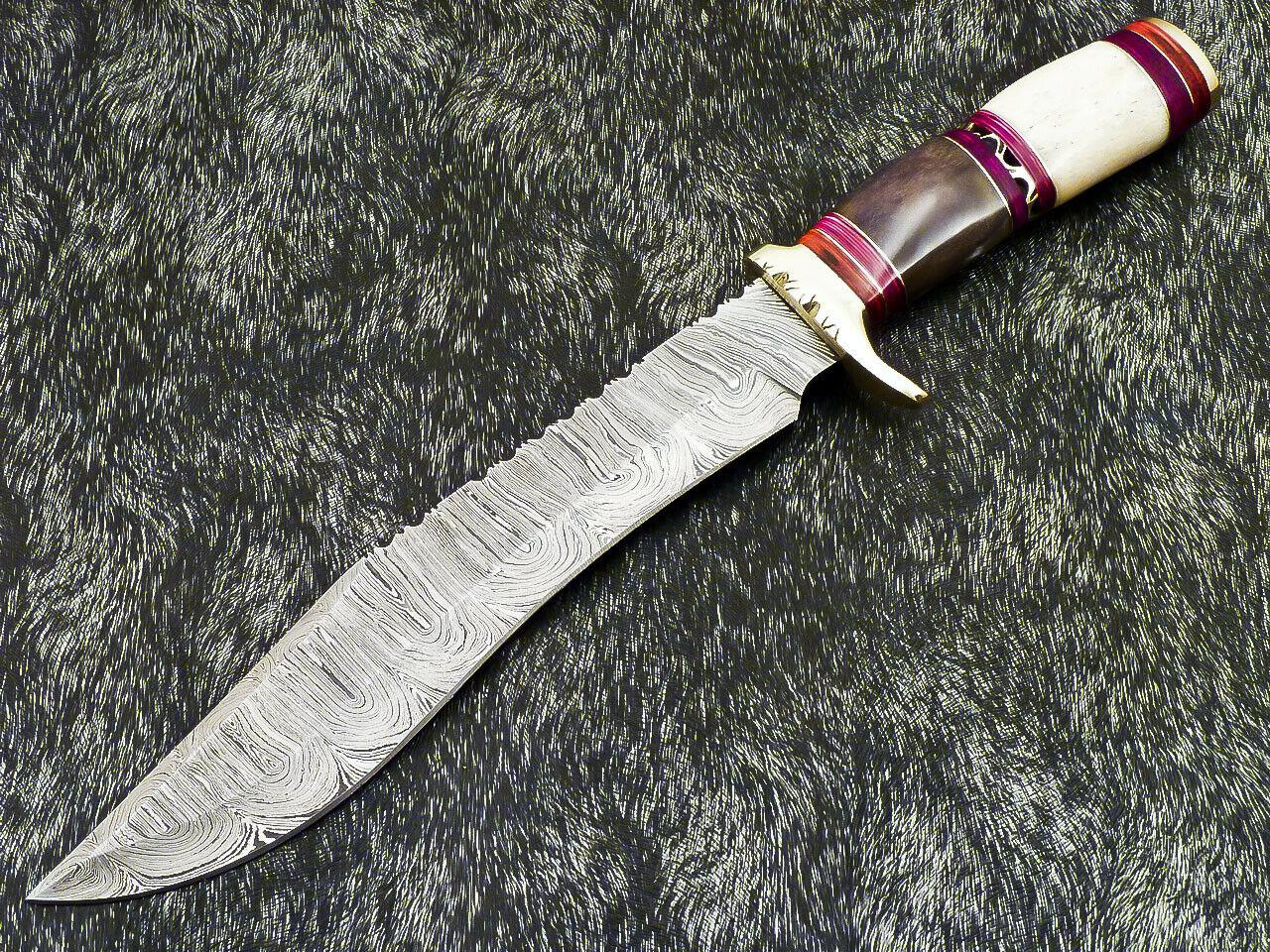 Authentic 14.5" Handmade Damascus Bowie Hunting Knife – Camel Bone Handle with Leather Sheath