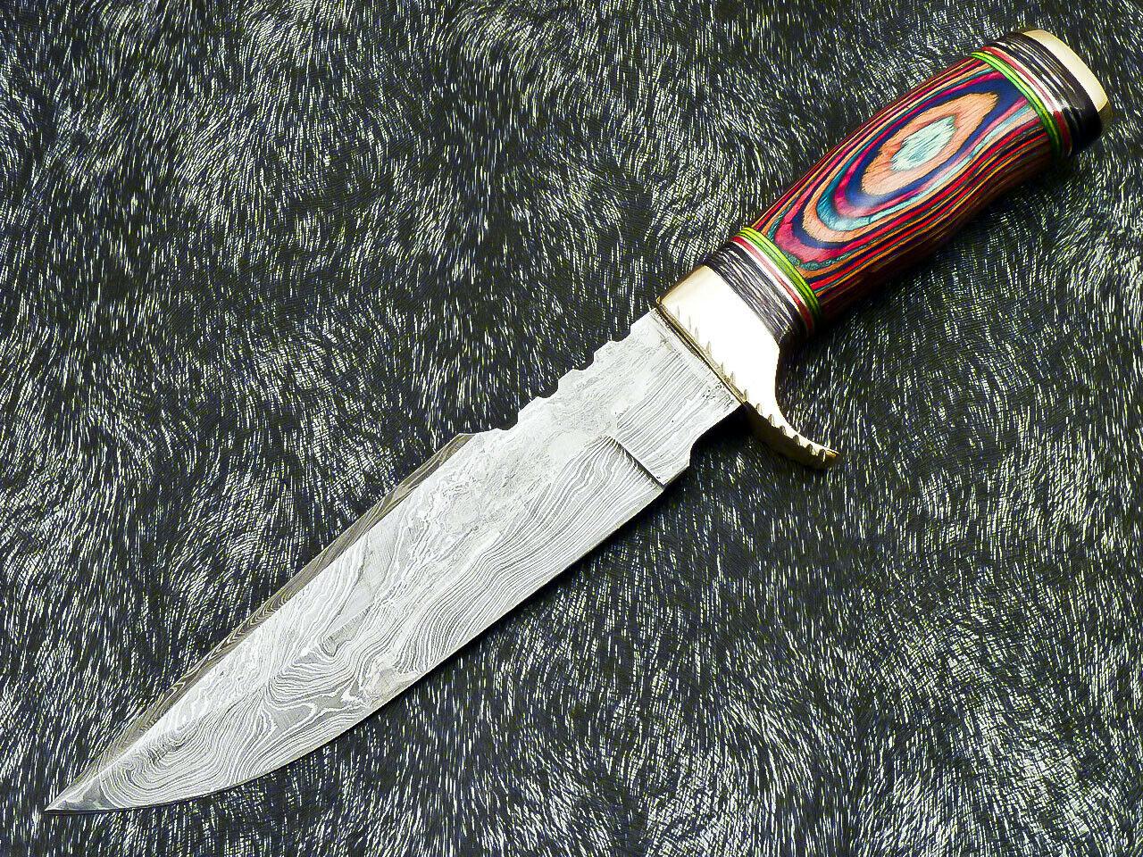 The handle is beautifully crafted from multicolor hardwood, accented with brass spacers and a hand-casted brass bolster for lasting strength and elegance. Measuring 12 inches overall with a 7-inch blade and 5-inch handle, this Bowie knife offers excellent ergonomics for hunting, camping, or everyday use.