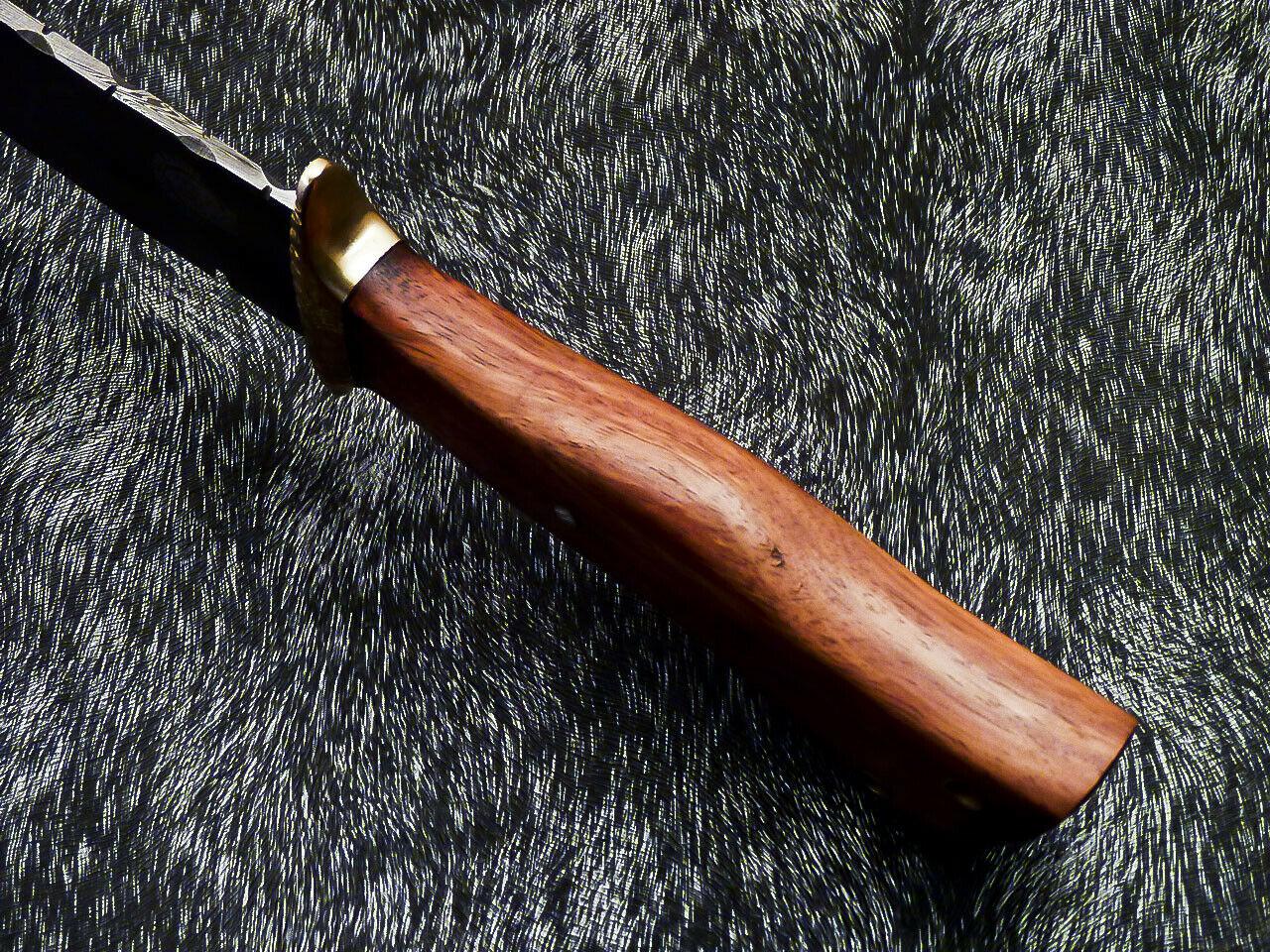 The handle is crafted from beautiful natural wood, complemented by brass spacers and a hand-casted brass bolster, ensuring both comfort and durability in hand. The knife comes with a sturdy leather sheath, completing this functional work of art. Please note, as each knife is handcrafted, slight variations in blade pattern and sheath may occur.