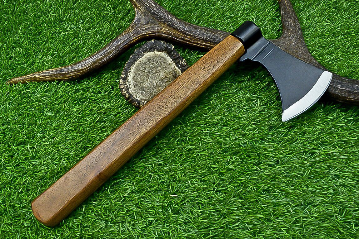 The handle is made from rosewood, providing a comfortable grip while maintaining strength and balance. With an overall length of 12 inches, this compact Viking axe is versatile and easy to handle. Each axe comes with a genuine leather sheath, ensuring safe storage and transport.