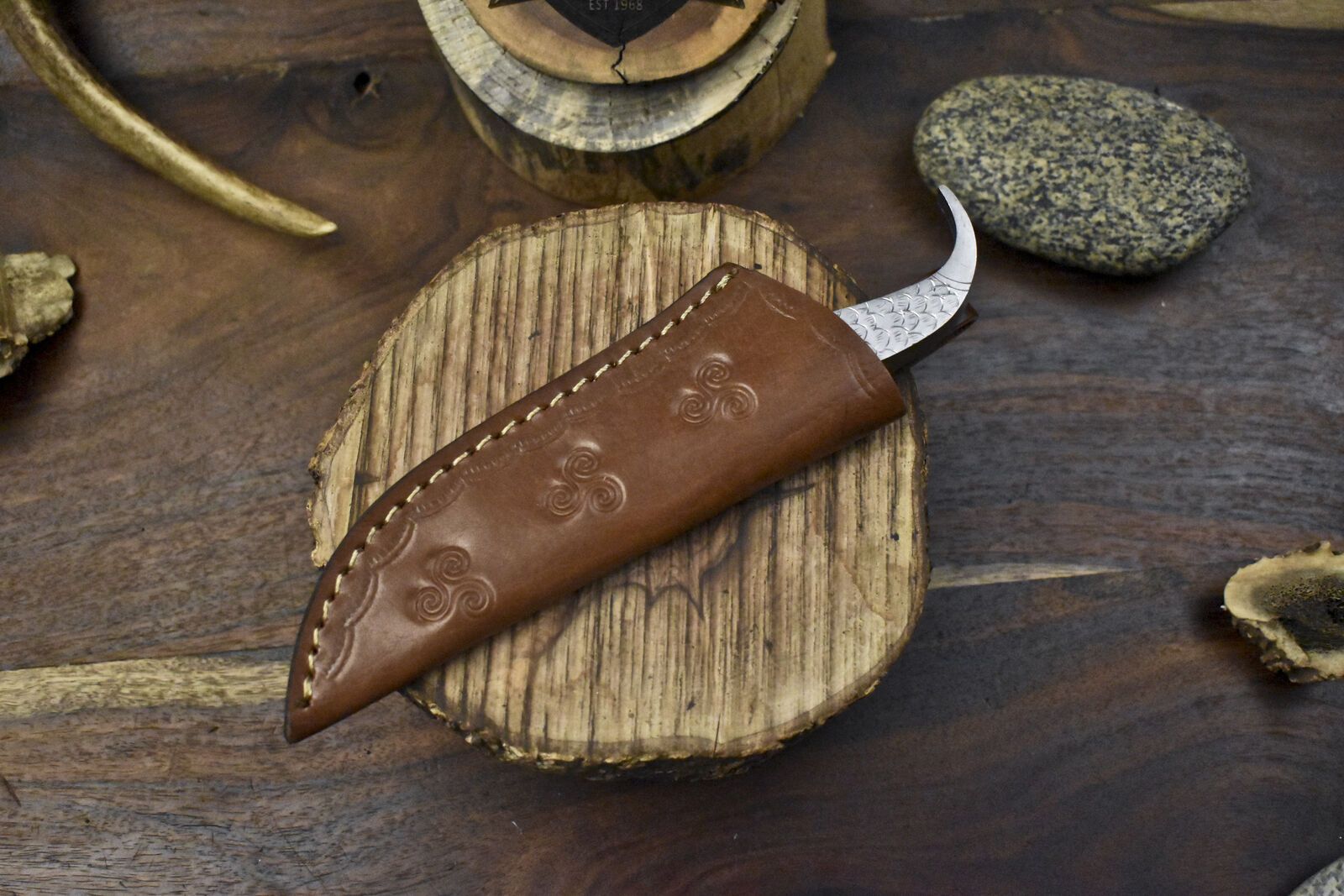 Whether used as a Damascus knife custom handmade fixed blade hunting knife skinner or proudly displayed, this blade performs with both functionality and style. The classic shape and sturdy construction make it a top choice for anyone seeking a reliable Damascus skinner hunting knife. It includes a premium leather sheath for safe carry and storage.