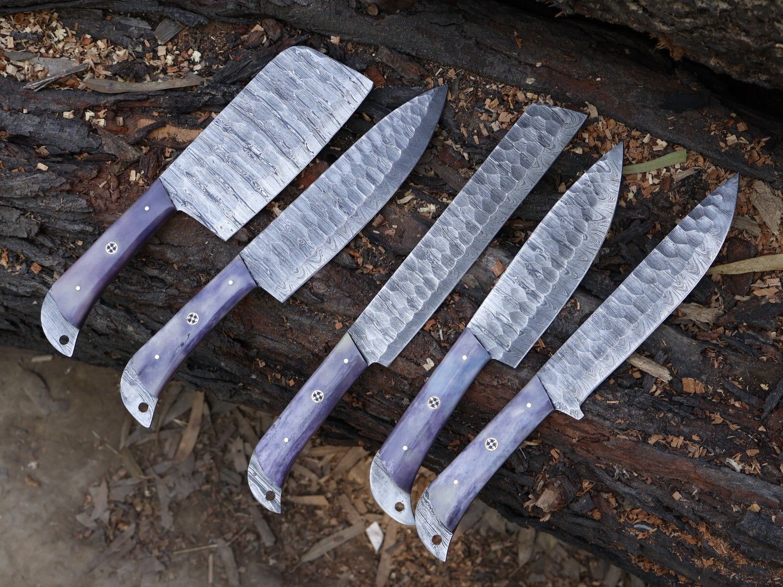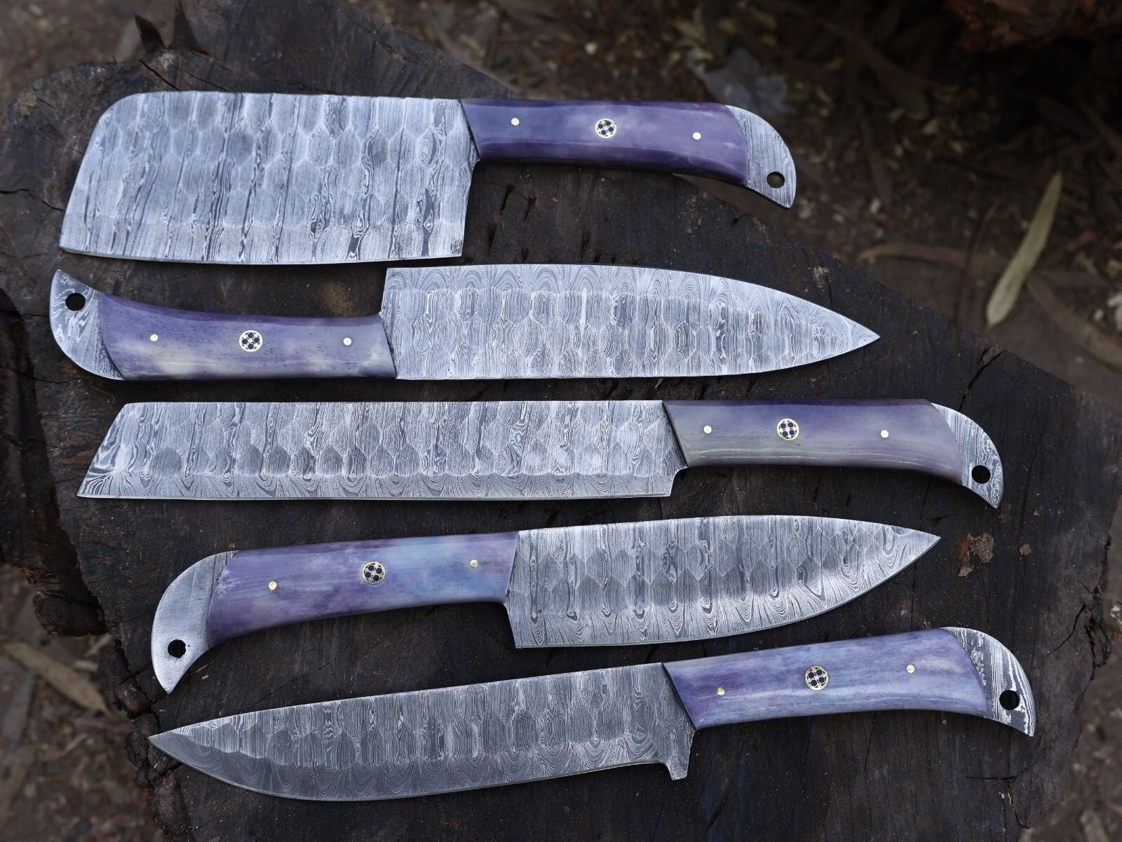 This exquisite 5-piece chef set from Heritage Forge is a true blend of craftsmanship and performance, handcrafted with premium Damascus steel blades and beautifully designed bone handles fastened with mosaic pins. Each knife in this set is hand forged with 512 layers of high carbon and stainless steels, delivering exceptional sharpness, durability, and a striking Damascus pattern. The blades are heat treated for a Rockwell hardness of 55-60 HRC, ensuring superior edge retention and reliable performance for both professional and home chefs. The set includes five knives: a cleaver chef knife with a 5.5-inch blade and 3.0-inch width, a 7-inch chef knife, another 7-inch chef knife, a 6-inch chef knife, and an 8-inch chef knife. Each knife handle measures approximately 5.0 inches, providing excellent balance and a comfortable grip. The spine of the blades showcases beautiful hand-forged detailing, adding an artistic touch to this fully functional kitchen tool set. This collection also includes a premium handmade leather sheath for safe storage and portability. Perfect for slicing, chopping, and preparing vegetables, meats, and more, this Heritage Forge Damascus chef set is not only a practical kitchen tool but also a stunning addition to any collection.