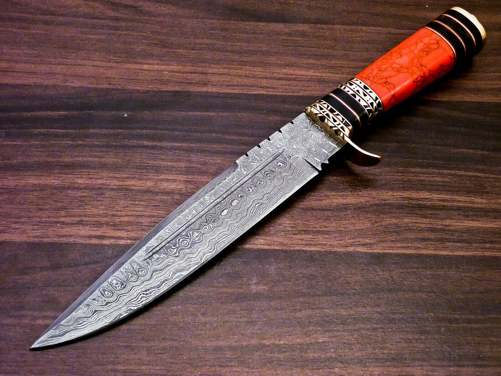Crimson Fang 13 Inch Damascus Bowie Knife | Red Jasper & Horn Brass Handle with Leather Sheath