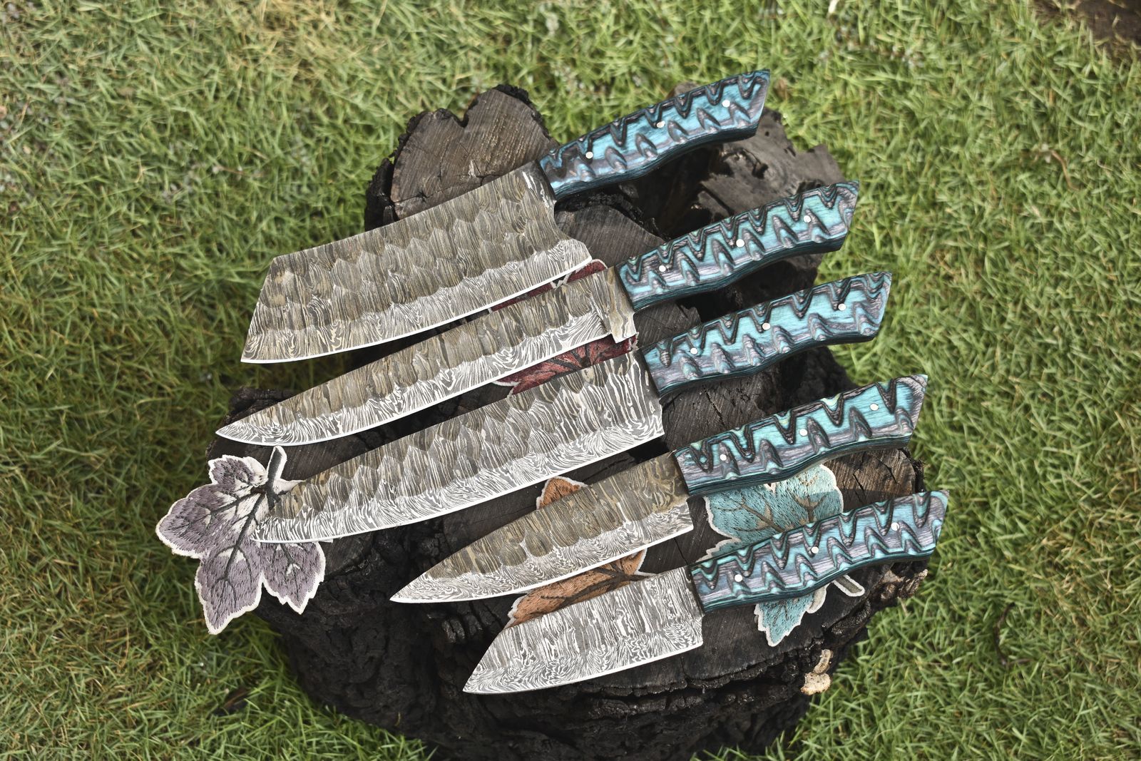 This Custom Chef Knife Set features a lot of 5 unique pieces, each crafted with a twist-pattern Damascus steel blade and premium hardwood handle. Measuring approximately 11.5 inches overall with a 7-inch blade and 4.5-inch handle, these knives are designed for both function and display. Forged from a blend of 1095 and 15N20 high-carbon steels, the blades are folded multiple times to create a stunning Damascus twist pattern that not only enhances durability but also delivers a striking aesthetic. Each blade is oil tempered to a hardness of 58-60 HRC, ensuring exceptional edge retention and performance. The hardwood handles provide a comfortable grip while complementing the intricate blade design. Whether used as multipurpose kitchen knives or showcased as decorative collector’s items, this set embodies craftsmanship, durability, and beauty.