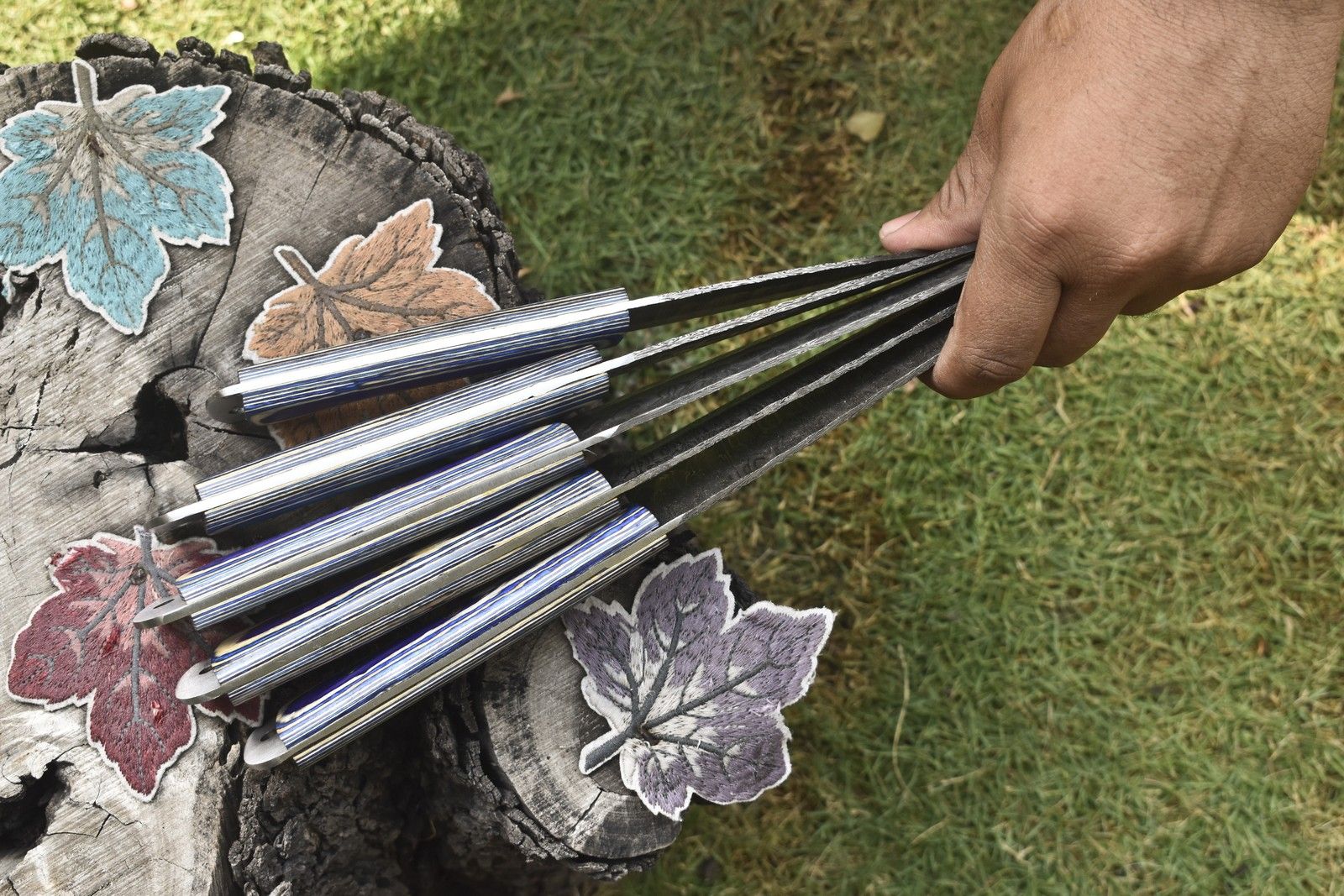 The knives are oil-tempered to 58-60 HRC for long-lasting sharpness, and each handle is hand-finished from premium hard wood for a secure and comfortable grip. This set of 5 knives is ideal for chopping, slicing, and survival applications, offering both functional performance and visual artistry. Each knife is unique due to the handmade nature of the Damascus steel and its twist pattern, making this set a remarkable addition to any knife collection.