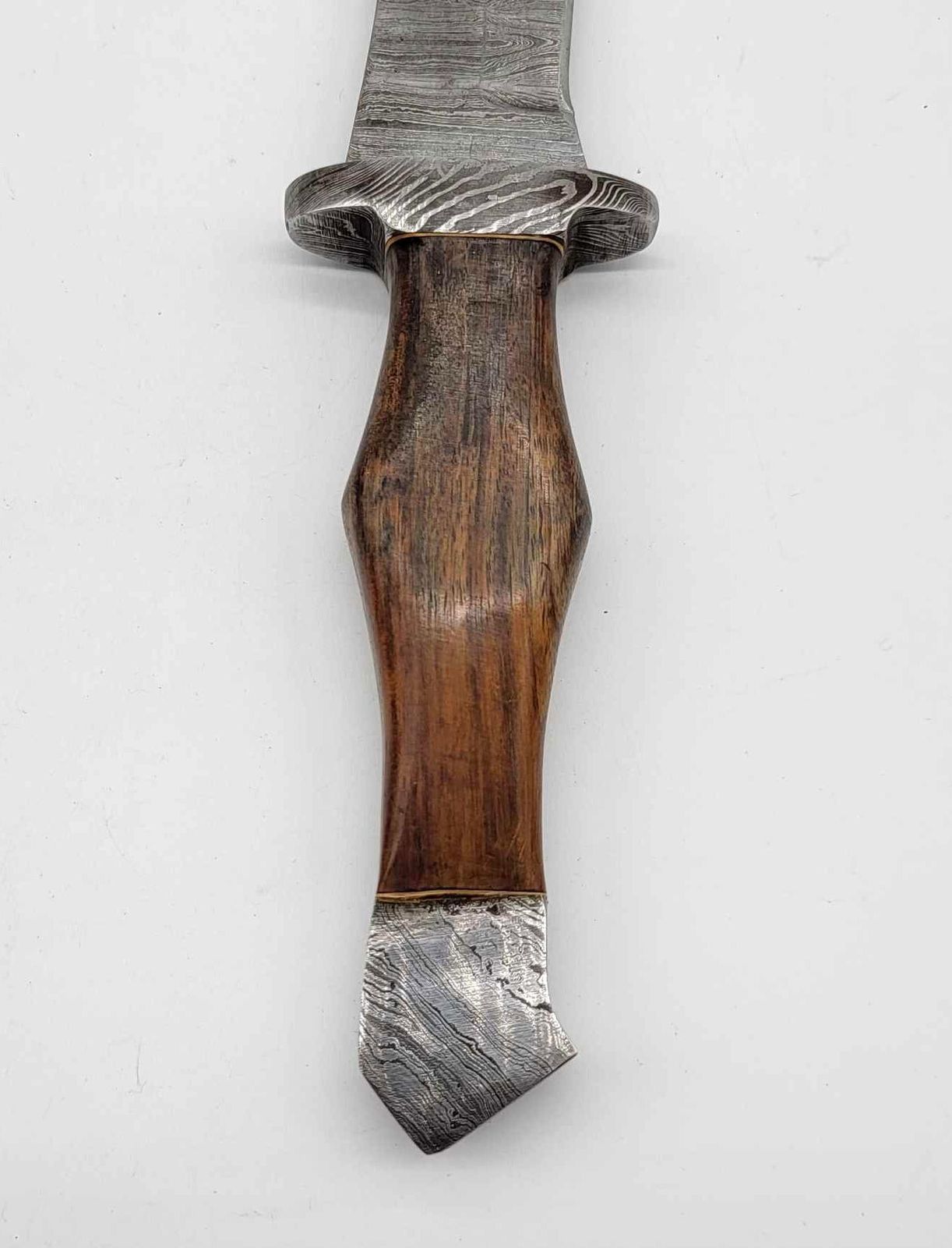 Built with a hidden tang construction, this knife showcases a shaped hardwood handle for a comfortable, balanced grip, and is accented by an angled Damascus pommel and full quillion guard for enhanced control and safety. The overall length of approximately 13 inches makes it a commanding and functional tool for hunters, outdoorsmen, or collectors.