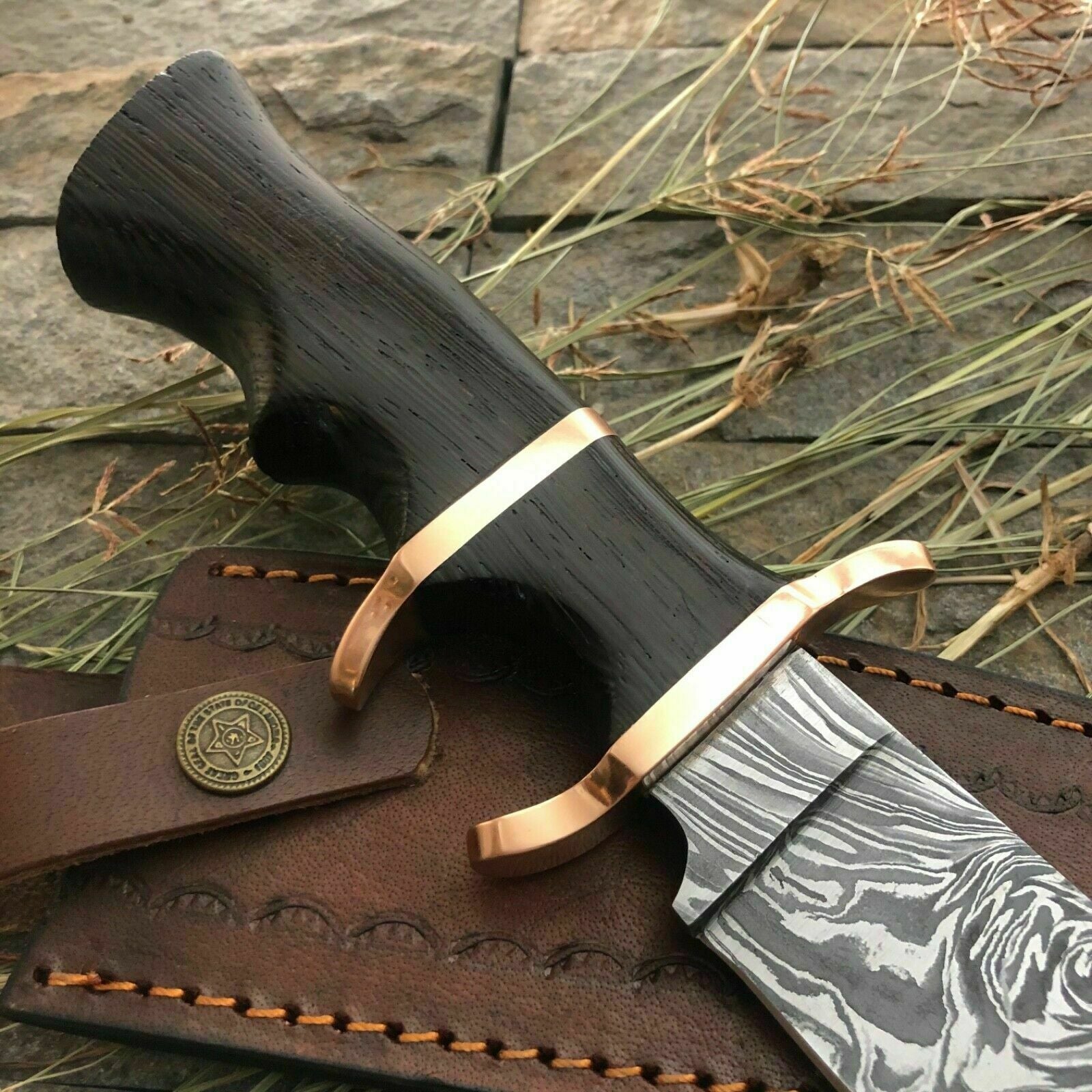 With an 8 inch sharpened blade and a 5 inch polished wood handle, the knife balances perfectly in hand. The handle features polished copper guards and a Damascus steel bolster, offering both durability and a traditional aesthetic. The twisted grain of the steel is beautifully offset by the rich wood grain, making each knife unique. A hand-stitched leather sheath is included for safe storage and carry. This custom handmade Bowie knife is ideal for outdoor use or as a collector’s showpiece. Hand tempered to a hardness of 58–60 HRC, it offers both beauty and battle-ready performance.