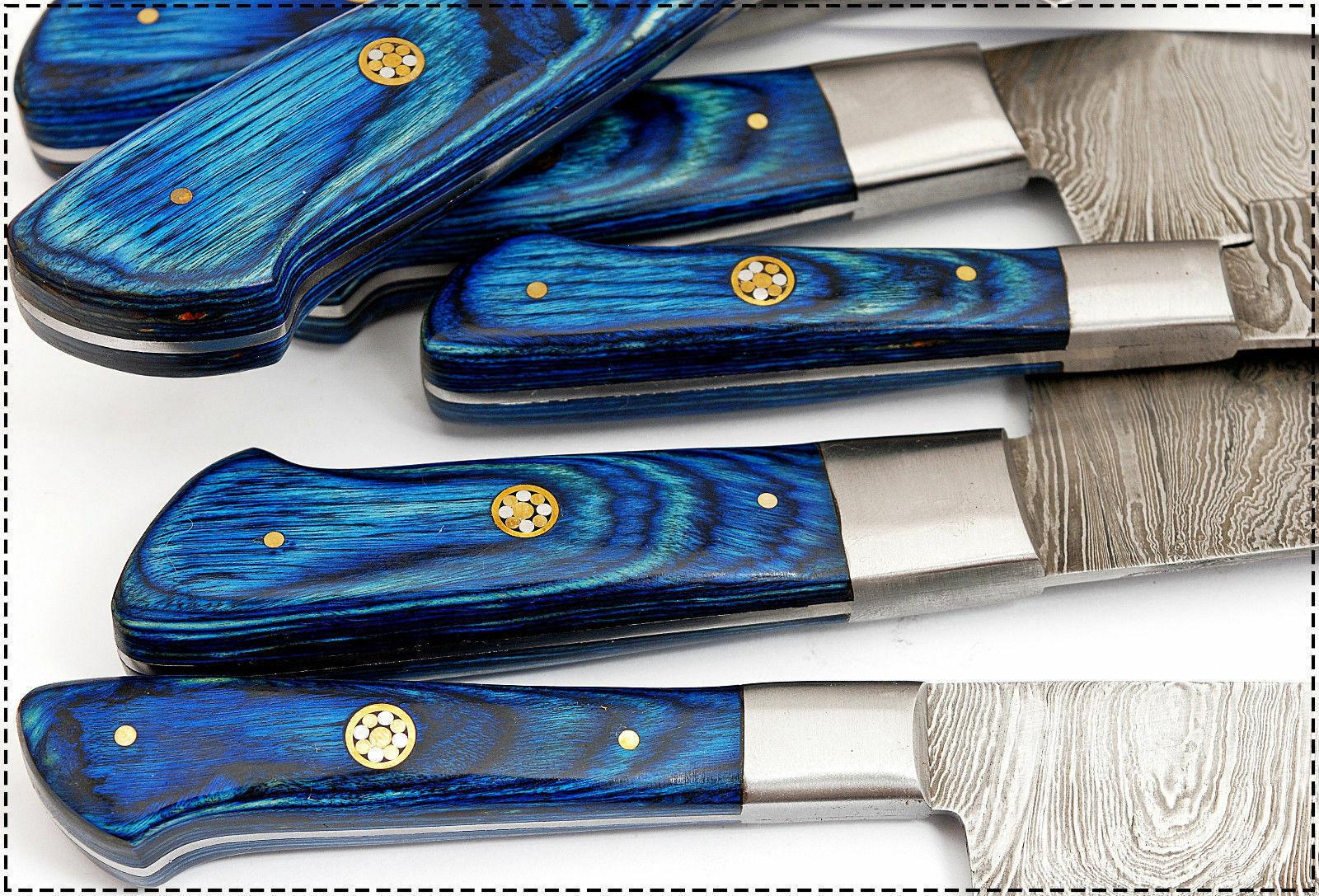 Custom Damascus Chef Knife Set – 6 Pc Pro Kitchen Knives with Blue Wood Handle