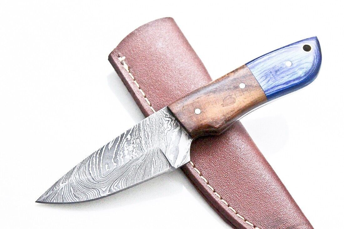 Custom Damascus Hunting Skinner Knife Wood Handle Fixed Blade with Leather Sheath