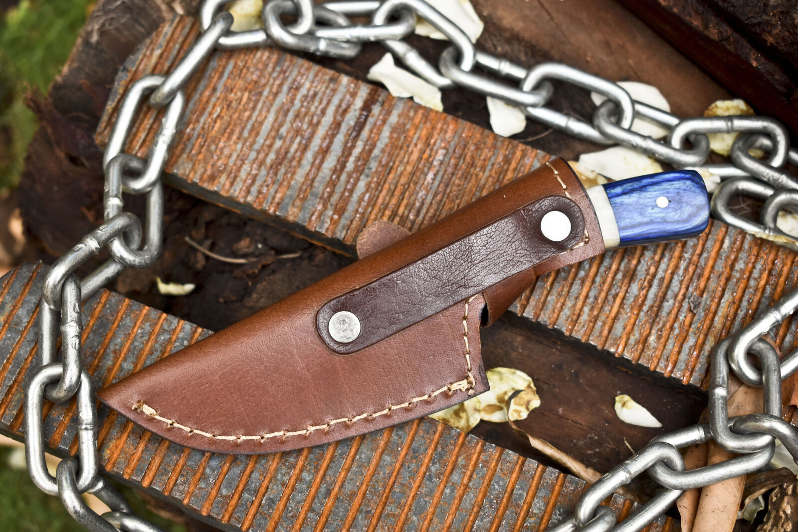This custom handmade fixed blade hunting knife skinner combines craftsmanship, beauty, and practicality for outdoor adventures, hunting, and collection. Forged from premium Damascus steel, crafted with a blend of 1095 and 15N20, the blade is repeatedly folded and oil tempered to 58–60 HRC for unmatched strength and edge retention. The ladder pattern Damascus features precise, clean lines that reflect light beautifully, giving this Damascus skinner hunting knife an elegant yet rugged character. Measuring 7 inches overall, with a 3-inch wide and rigid blade, it excels at skinning and field dressing. The polished bone and wood handle with a sturdy wooden bolster offers both style and a secure grip for precision work. Each knife is a one-of-a-kind piece with its own unique Damascus pattern. This Damascus acid etched fixed skinner knife includes a premium, hand-tooled leather sheath, ensuring safe carry and long-lasting protection. Perfect for hunters, hikers, and collectors, it blends durability with refined artistry. Built to perform and desig