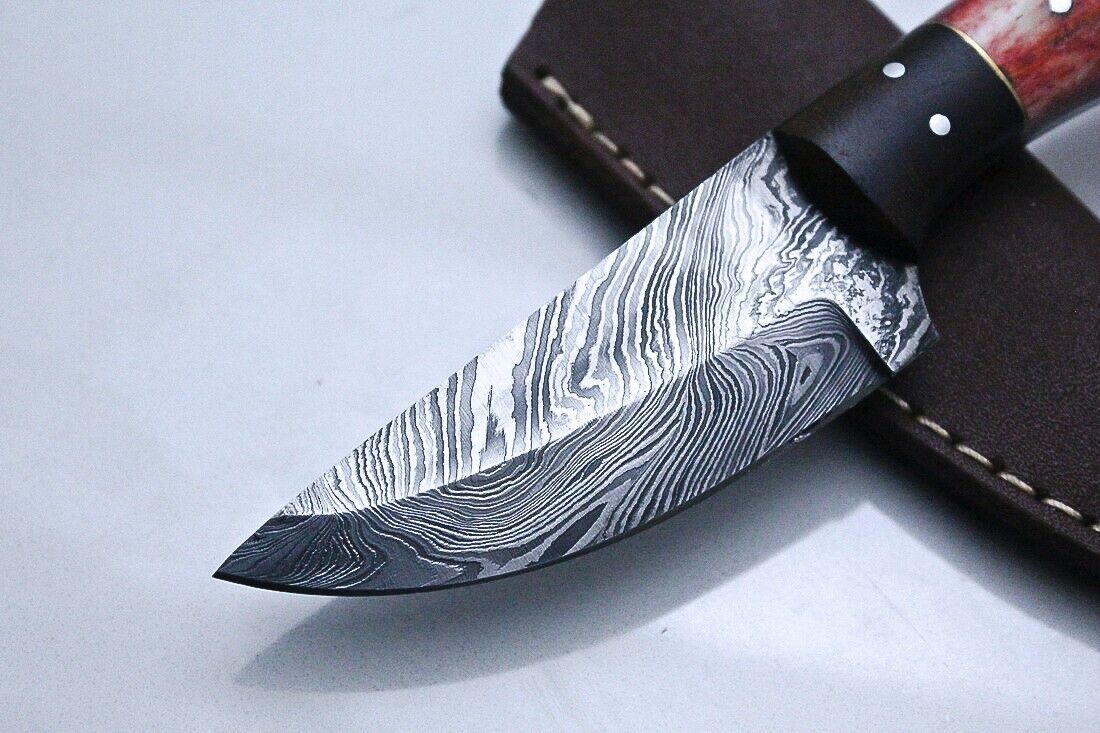 This custom handmade Damascus steel skinner knife is a reliable companion for hunting, skinning, and outdoor tasks. The blade is crafted from high-quality 352-layer Damascus steel, forged by folding 1095 and 15N20 steel together to create a distinct pattern and a razor-sharp edge. With a hardness rating of HRC 57–60, the blade delivers excellent edge retention, cutting power, and durability in the field.