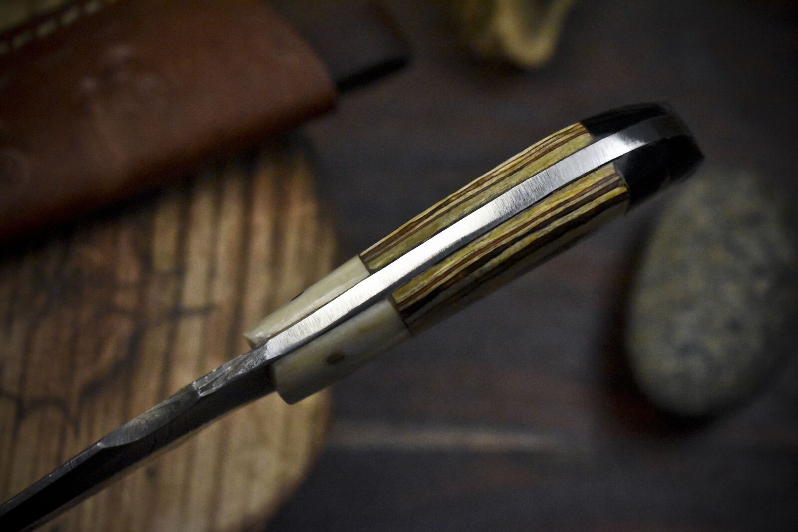 The handle is made from durable hard wood, shaped for a secure grip, and designed to withstand rugged outdoor use. Whether you're skinning game or handling camp chores, this knife is compact, agile, and efficient—ideal for field dressing and EDC carry. As a damascus knife custom handmade fixed blade hunting knife skinner, it balances ruggedness with elegance.