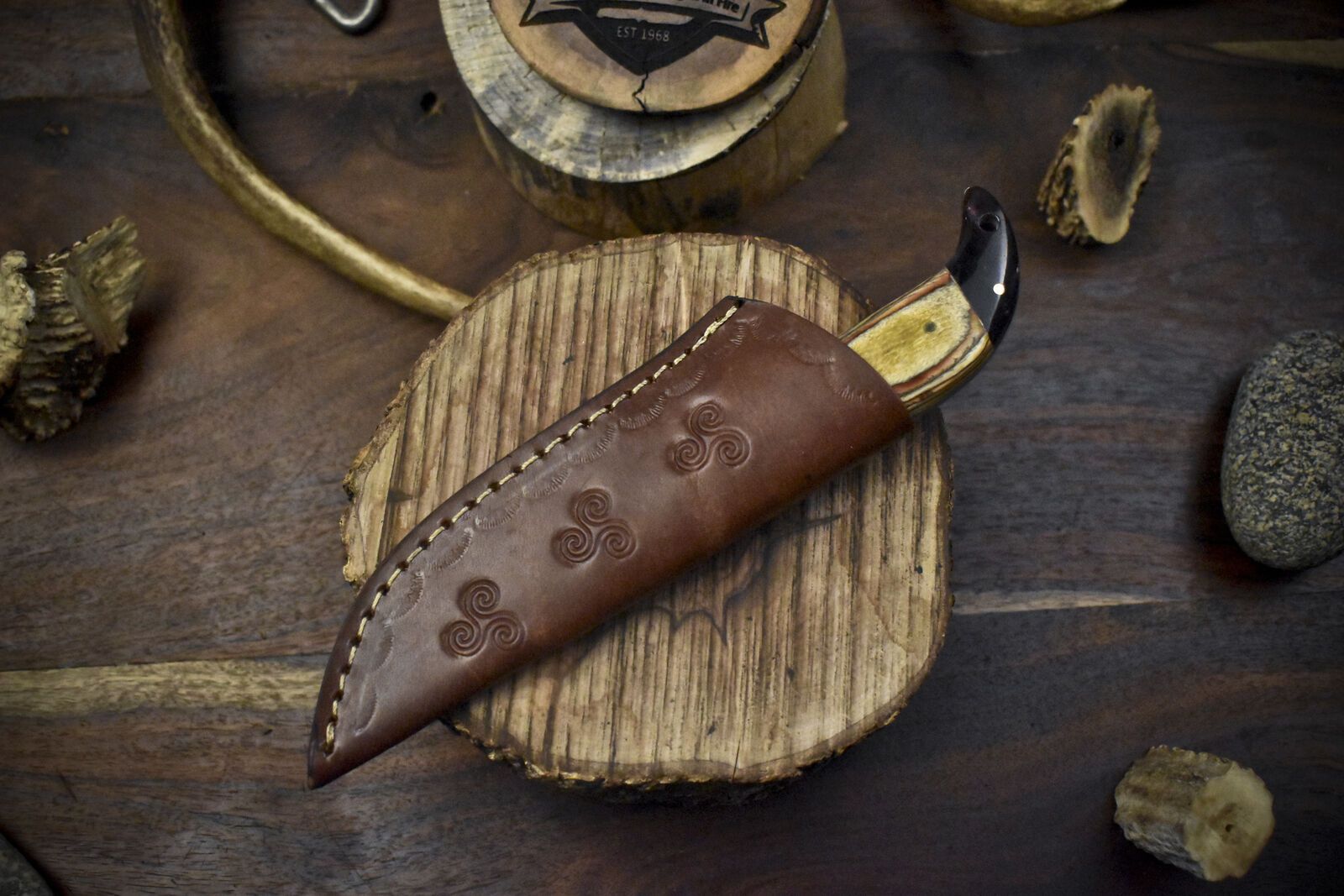 Perfect for collectors, hunters, and outdoor lovers, this limited edition damascus skinner knife comes with a hand-tooled leather sheath for secure storage. Whether you're on a camping trip or adding to your gear, this damascus skinner hunting knife is a reliable, standout tool.