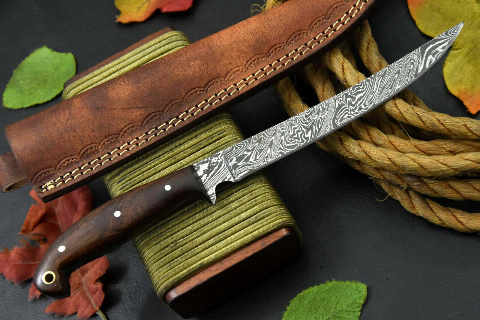 This Custom Handmade damascus fillet knife with Walnut Handle is crafted for hunters, anglers, and professional kitchen users who demand precision and durability. Built as a premium damascus steel fillet knife, it delivers razor sharp performance, flexibility, and long lasting edge retention. Whether you need a reliable damascus fishing knife, a precision damascus filleting knife, or a clean slicing damascus fish knife, this blade ensures smooth and accurate cuts. Designed as a high quality custom fillet knife, it stands among the finest handmade fillet knives known for craftsmanship and uniqueness. If you are searching for the best fillet knife for hunting or a dependable good fillet knife for daily kitchen use, this blade offers strength, balance, and professional performance. This premium damascus steel knife comes complete as a fillet knife with sheath, featuring a 100% cow leather sheath for protection and easy carry. This versatile fillet knife is ideal for both field and kitchen applications.