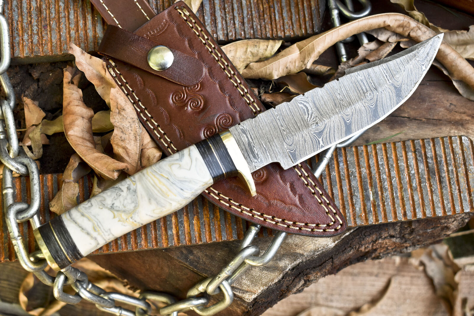 Every knife comes with a hand-tooled, extra-thick leather sheath for secure storage and transport. Each piece is 100% handmade with no CNC or water-jet machining, ensuring every knife is a rare and unique work of craftsmanship. Perfect for outdoor enthusiasts or collectors seeking a premium Damascus skinner knife.
