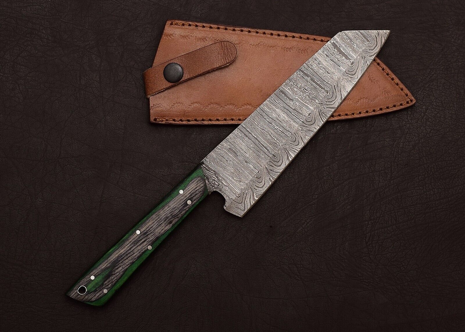 Discover the craftsmanship of this Custom Handmade Damascus Steel Outdoor Kitchen Chef Knife, designed for chefs, hunters, and outdoor enthusiasts. The 8-inch Damascus steel blade (15N20) is hand-forged to deliver exceptional sharpness, durability, and a striking patterned finish. Perfectly balanced with a 5-inch Pakka Wood handle and wood bolster, this knife ensures a secure and comfortable grip for precise cutting and long-lasting use. Its versatile design makes it suitable as a chef knife, hunting knife, skinning knife, bowie knife, camping knife, survival knife, and general kitchen knife. Each knife is one-of-a-kind, featuring a unique Damascus pattern forged by skilled artisans.