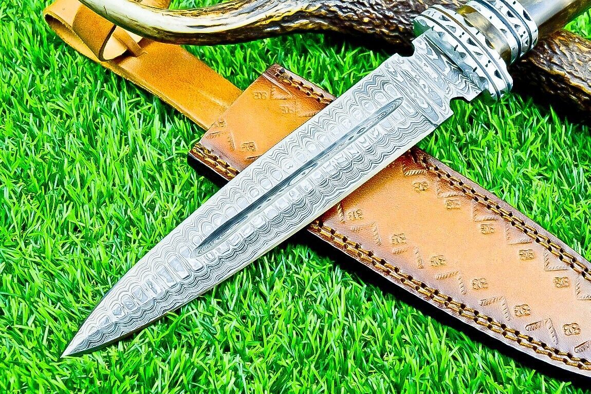 This custom handmade dagger knife is a flawless blend of traditional craftsmanship and modern design. Forged with premium Damascus steel, this 12.5-inch double-edged blade is tailored for hunting, camping, and combat survival. Featuring a symmetrical design, this knife delivers piercing performance from both edges, making it an ideal tool for versatile outdoor and tactical applications.