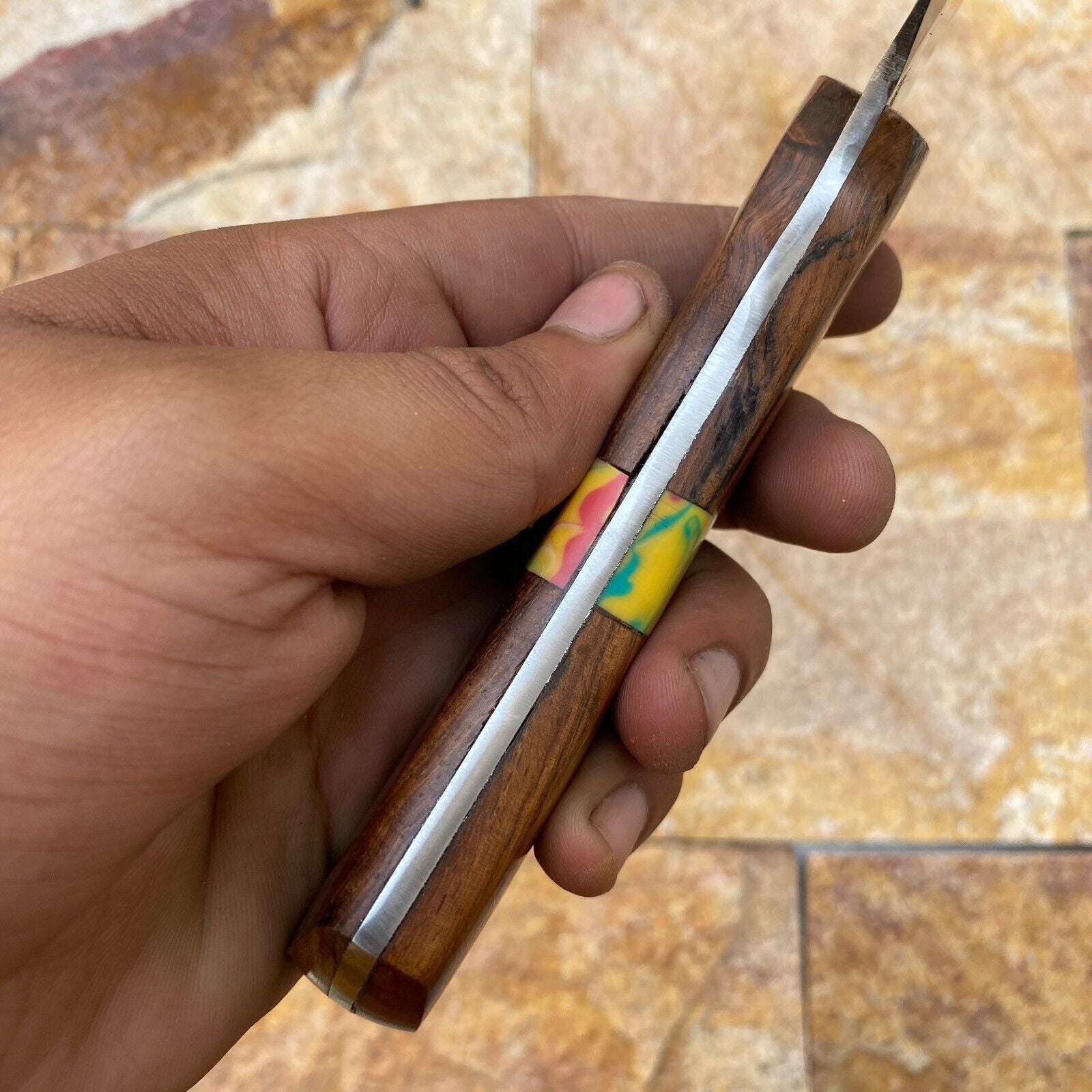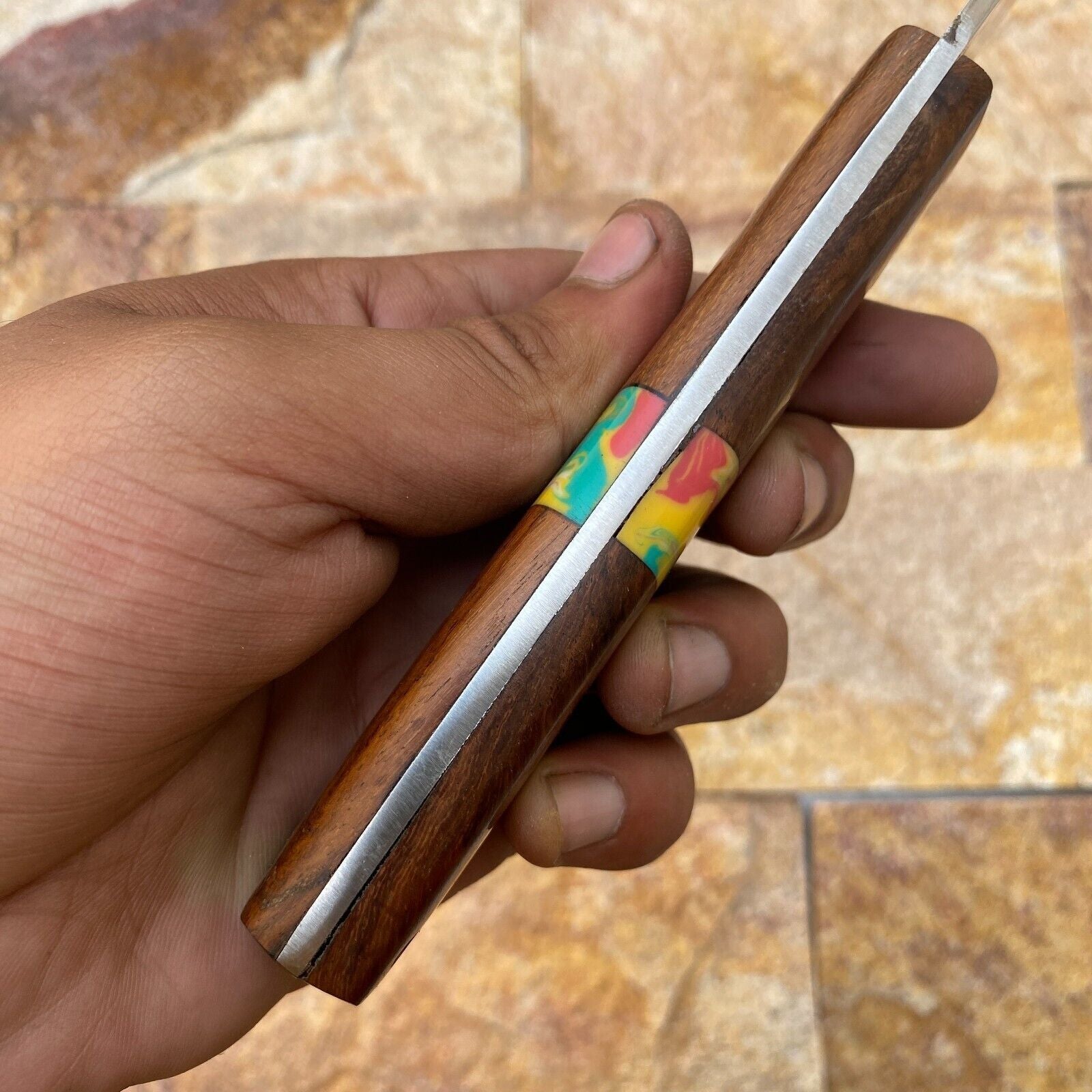 With an overall length of 12.5 inches, an 8-inch razor-sharp blade, and a 4.5-inch comfortable handle, this chef knife is perfectly balanced for precision cutting. Each knife is 100% handcrafted, featuring premium-quality materials with meticulous attention to detail. The high polish finish enhances its elegance, while the robust construction guarantees durability. Ideal for chefs, home cooks, and collectors, this knife delivers superior control, balance, and beauty in every cut.