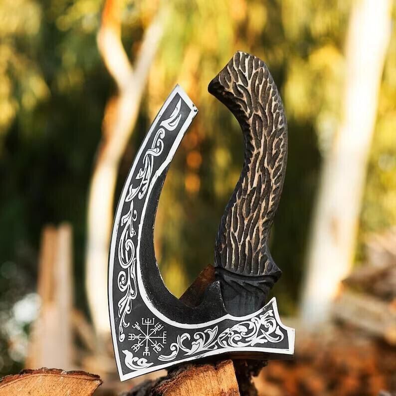 This custom forged viking combat axe is a versatile tool designed for both functionality and collectability. Hand-forged from high-quality carbon steel with a full tang, the blade delivers durability and strength for demanding outdoor use. Measuring approximately 20 inches in overall length, this war axe viking offers the perfect balance between cutting efficiency and portability, making it ideal for bushcraft, camping, or forest survival tasks. The polished wooden handle provides a secure grip and an authentic feel, giving this piece the strength of a working two handed viking axe while maintaining the aesthetic of a traditional viking dane axe. Its elegant silver-toned finish and craftsmanship echo the artistry of authentic vikings battle axe designs, while honoring the rugged legacy of steel axe osrs, steel city axes, and the steel woods axe. Complete with a protective custom case, this replica viking axe is safe to transport and display, ensuring longevity and practicality. Whether you’re a collector, outdoor adventurer, or historical enthusiast, this axe embodies the spirit of the viking fighting axe and pays tribute to the legendary viking crossed axes motif, making it a must-have addition to any arsenal of viking war axes.