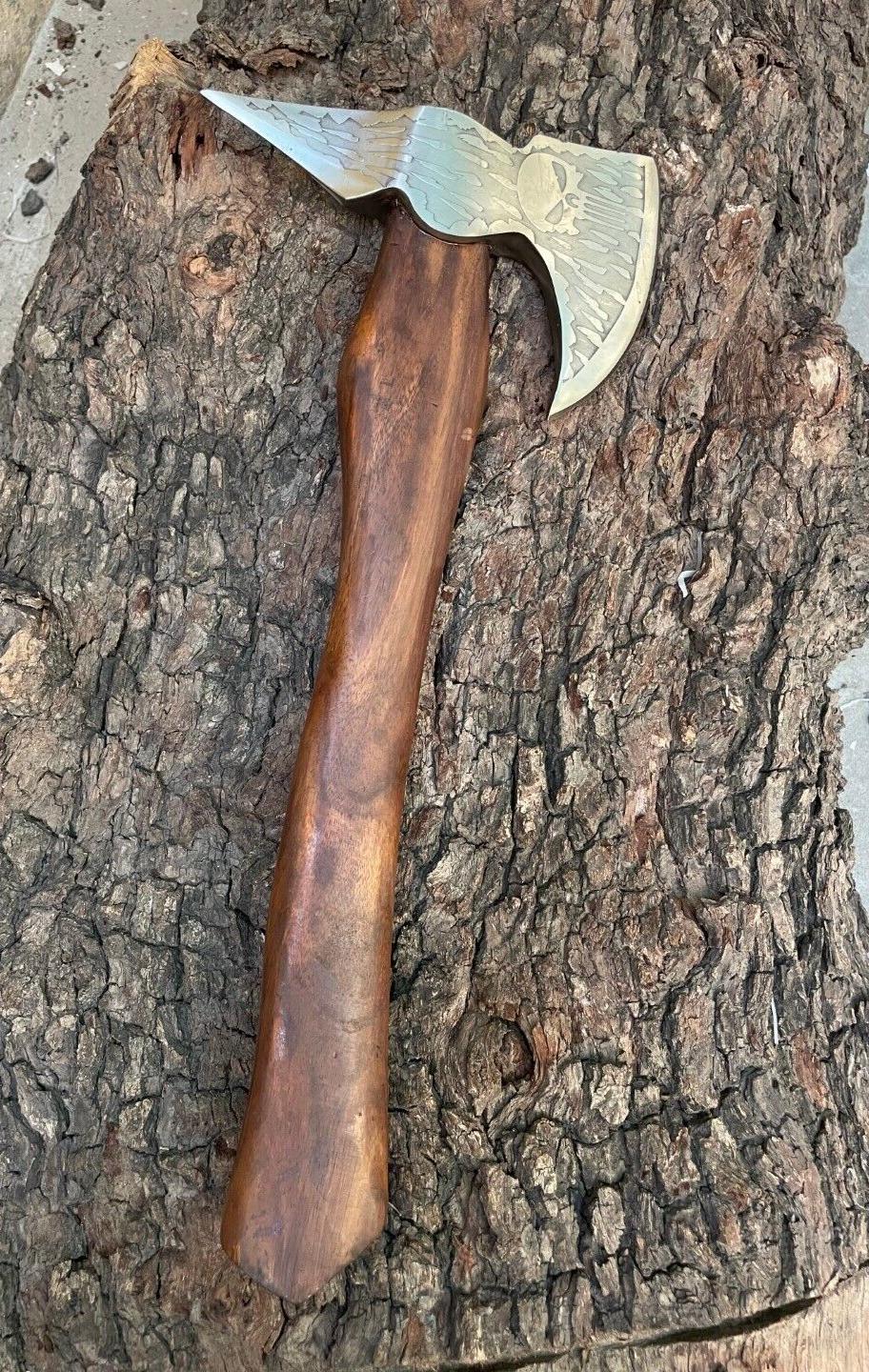 Custom Forged Replica Viking Axe with Etched Carbon Steel Head and Wooden Handle for Camping and Bushcraft